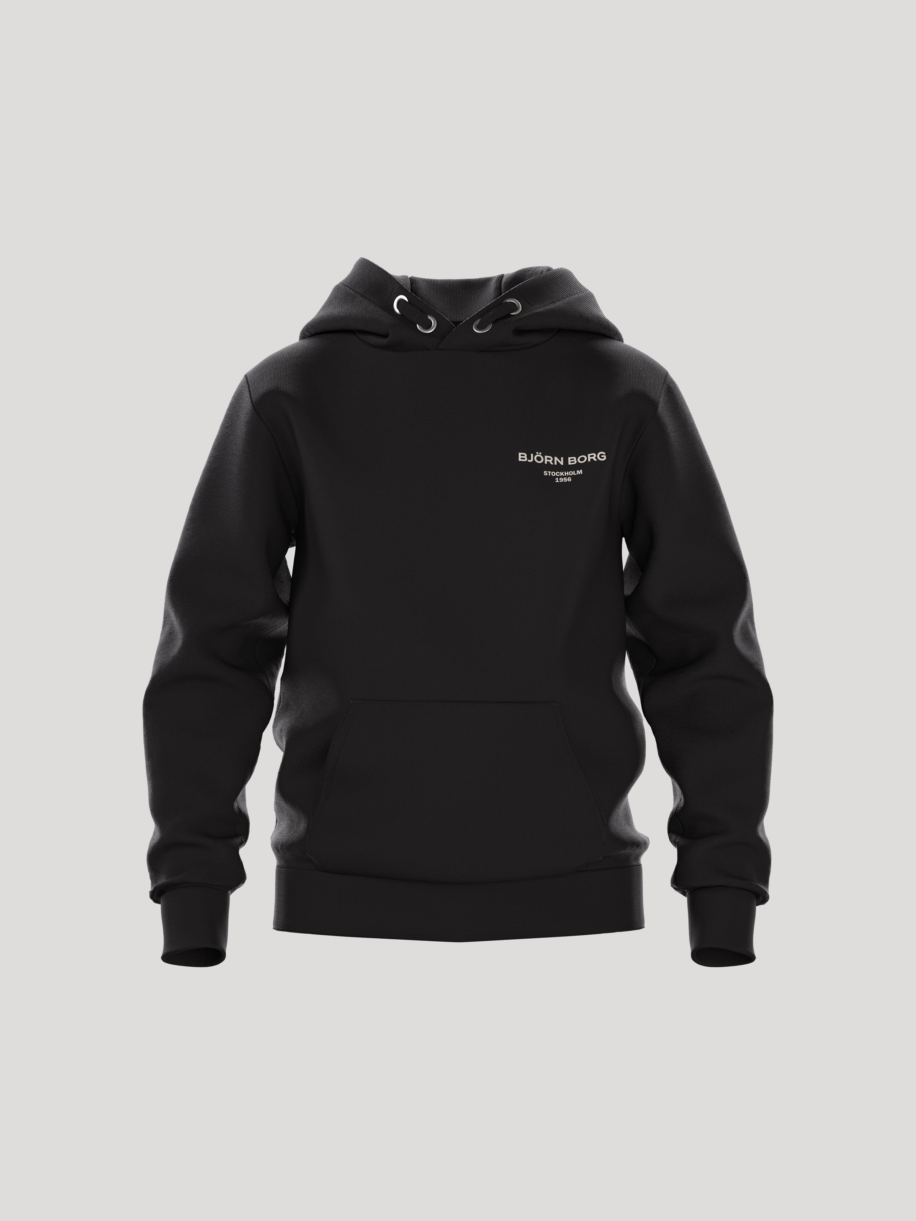 The Björn Borg Essential 1 hoodie in black is a soft garment ideal for layering. The material is a blend of cotton and recycled brushed polyester fleece, making the hoodie warm and comfortable to wear. The hoodie features a regular fit, making it suitable for everyday wear and activities, and the kangaroo pocket provides space to rest your hands or carry essential items. The front of the long-sleeved hoodie has a small Björn Borg logo detail, along with the brand’s signature striped pattern on the inside of the neckline, which reinforces the seam and adds extra comfort around the neck area.