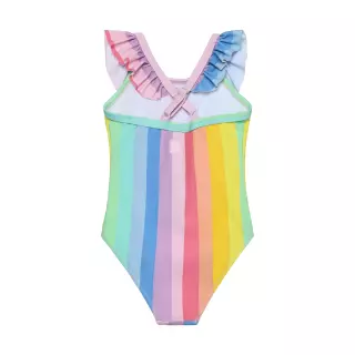 Adorable Color Kids multicolored swimsuit in rainbow shades, featuring cute ruffles. This comfortable and breathable rainbow pattern swimsuit is made from elastic material, making it comfortable to wear and easy to move in. Additionally, the swimsuit dries quickly. Certified according to OEKO-TEX® STANDARD 100.