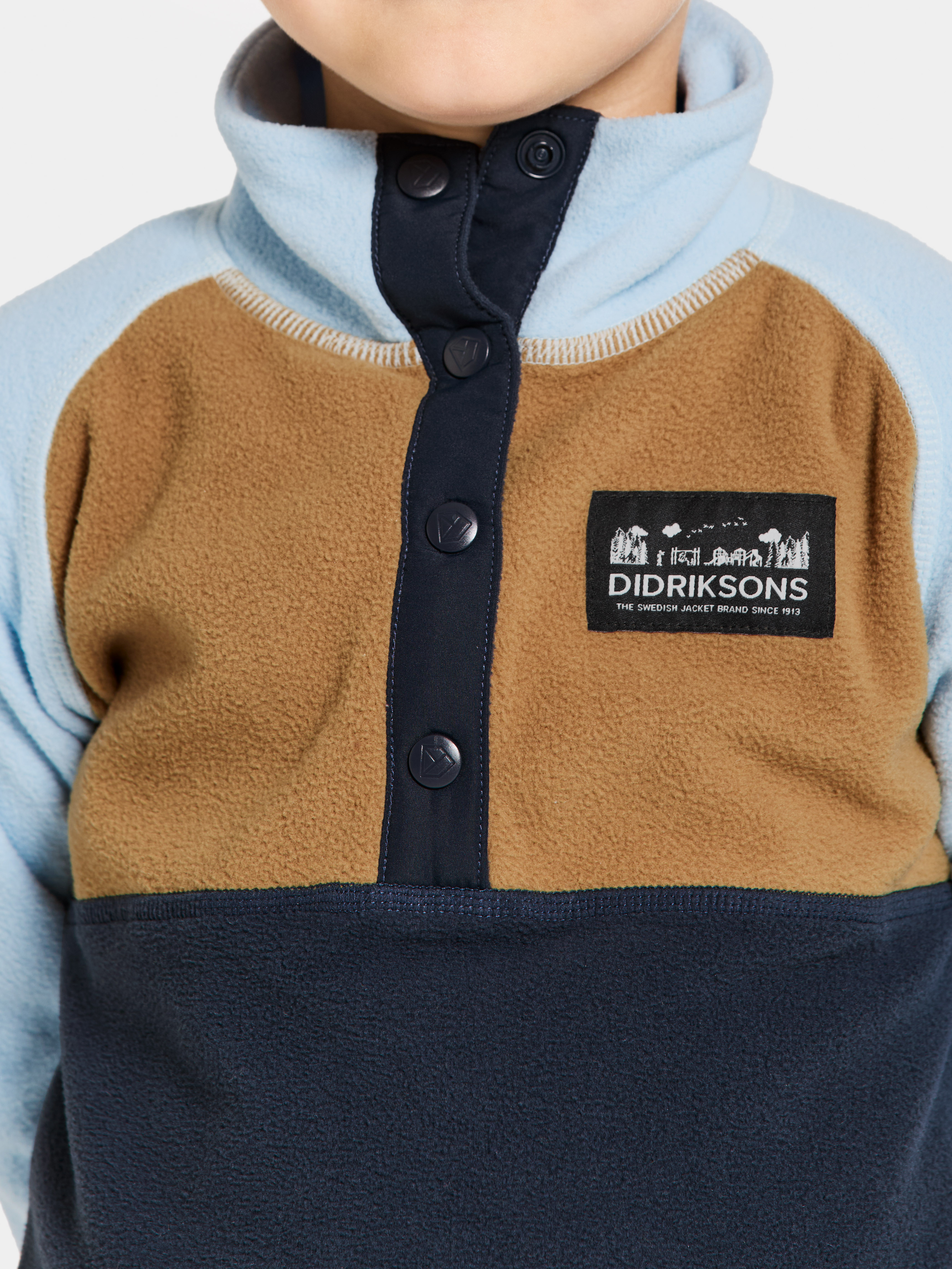 Didriksons Monte is a comfortable mid-layer designed for extra movability and play. The sweater is made of a thermal microfleece for comfortable warmth. It could be worn indoors or outdoors depending on the season and temperature. Four buttons on the front.