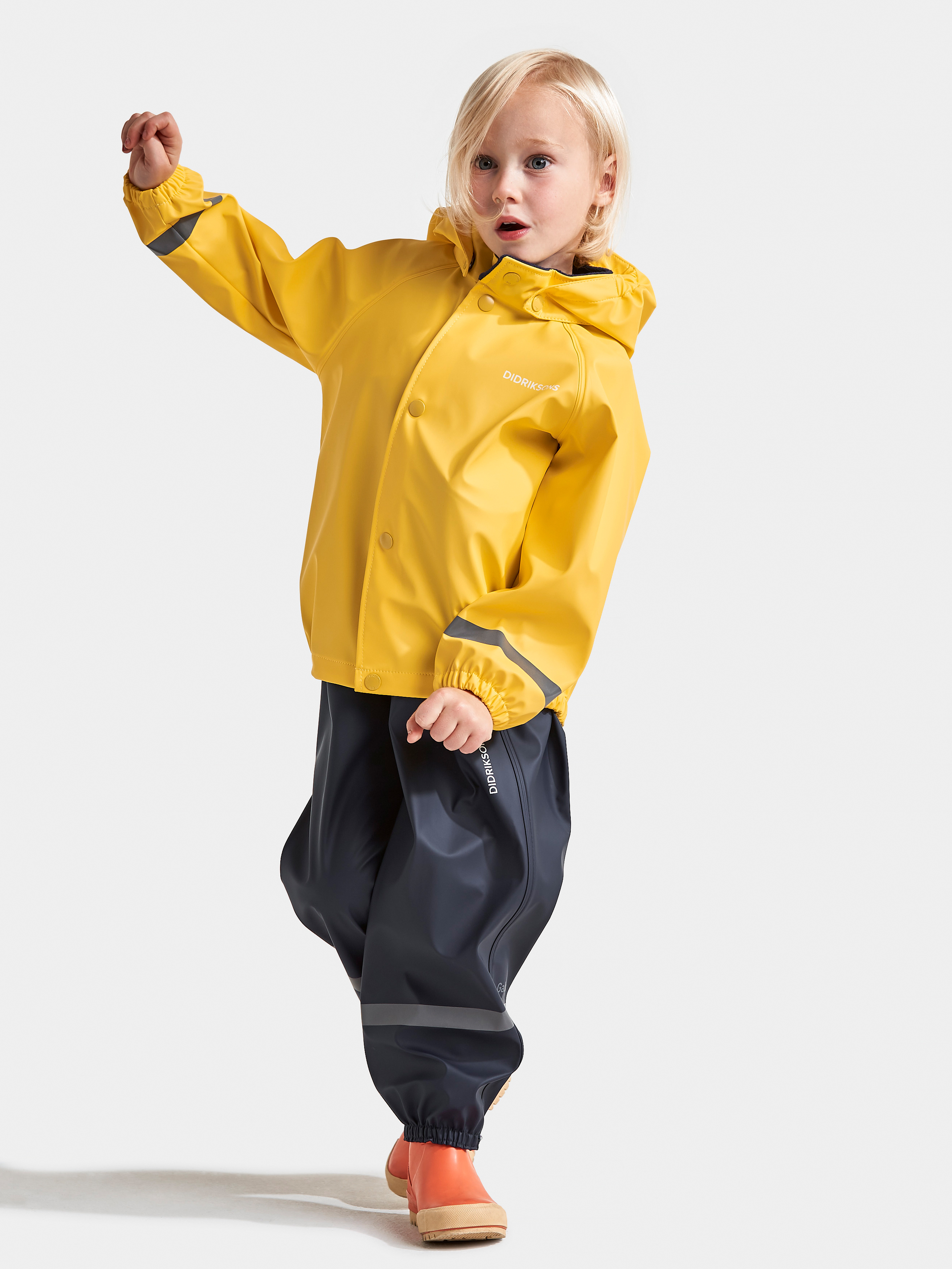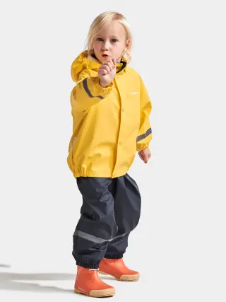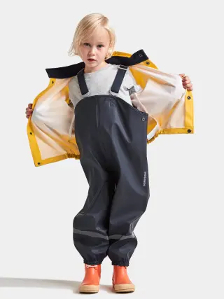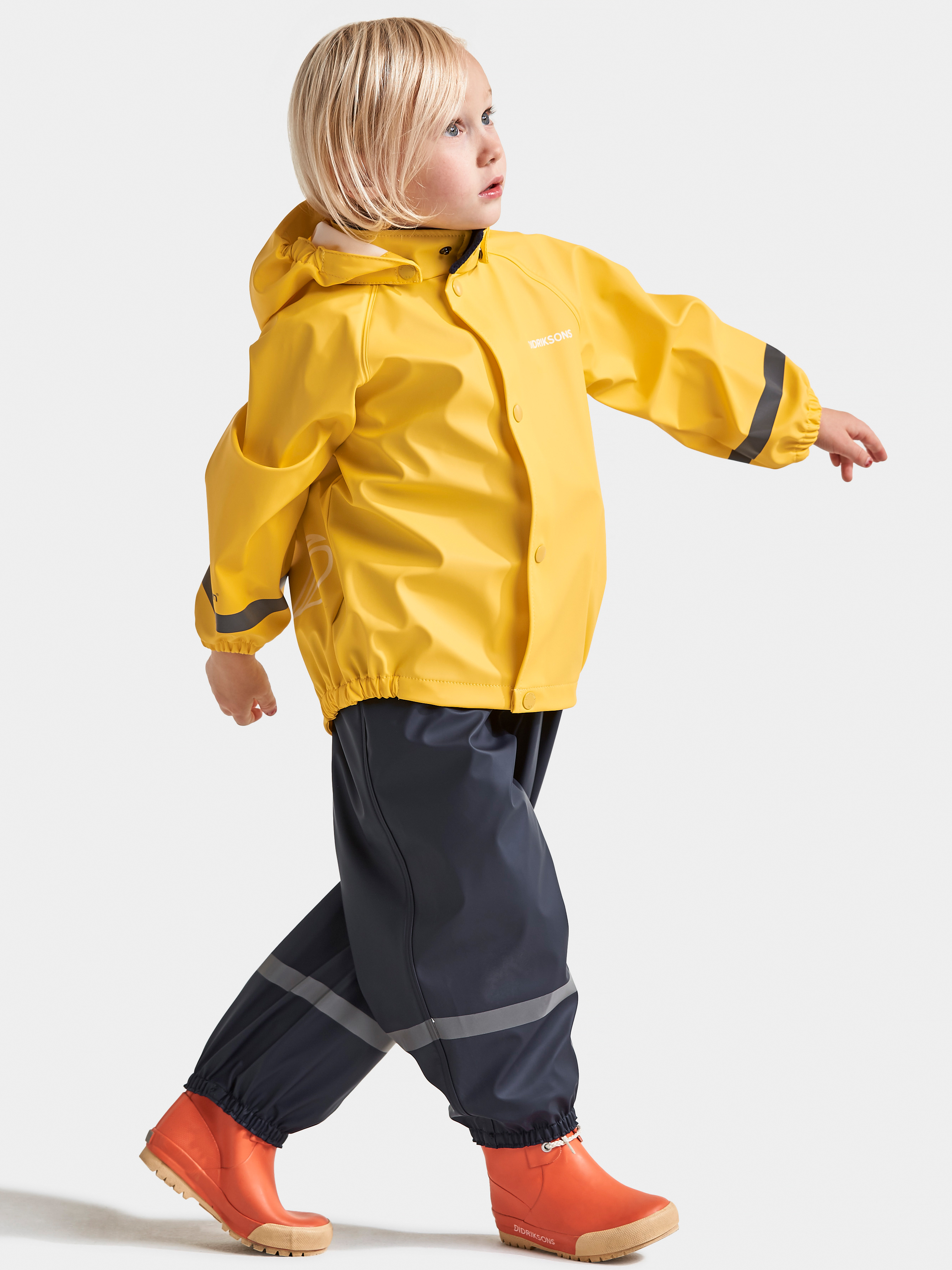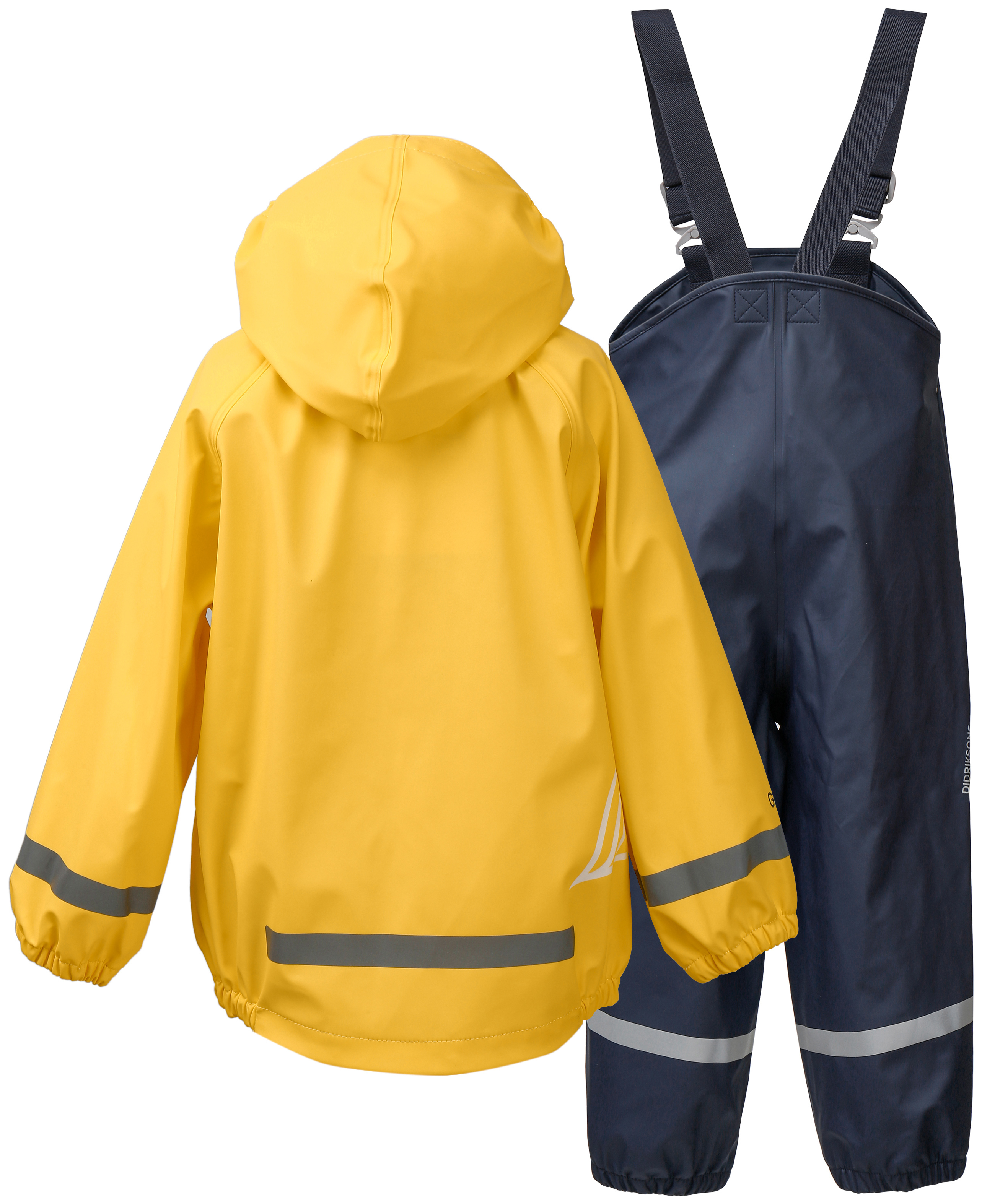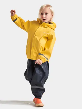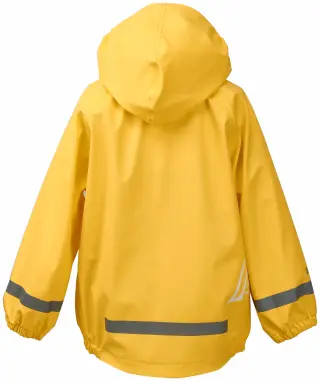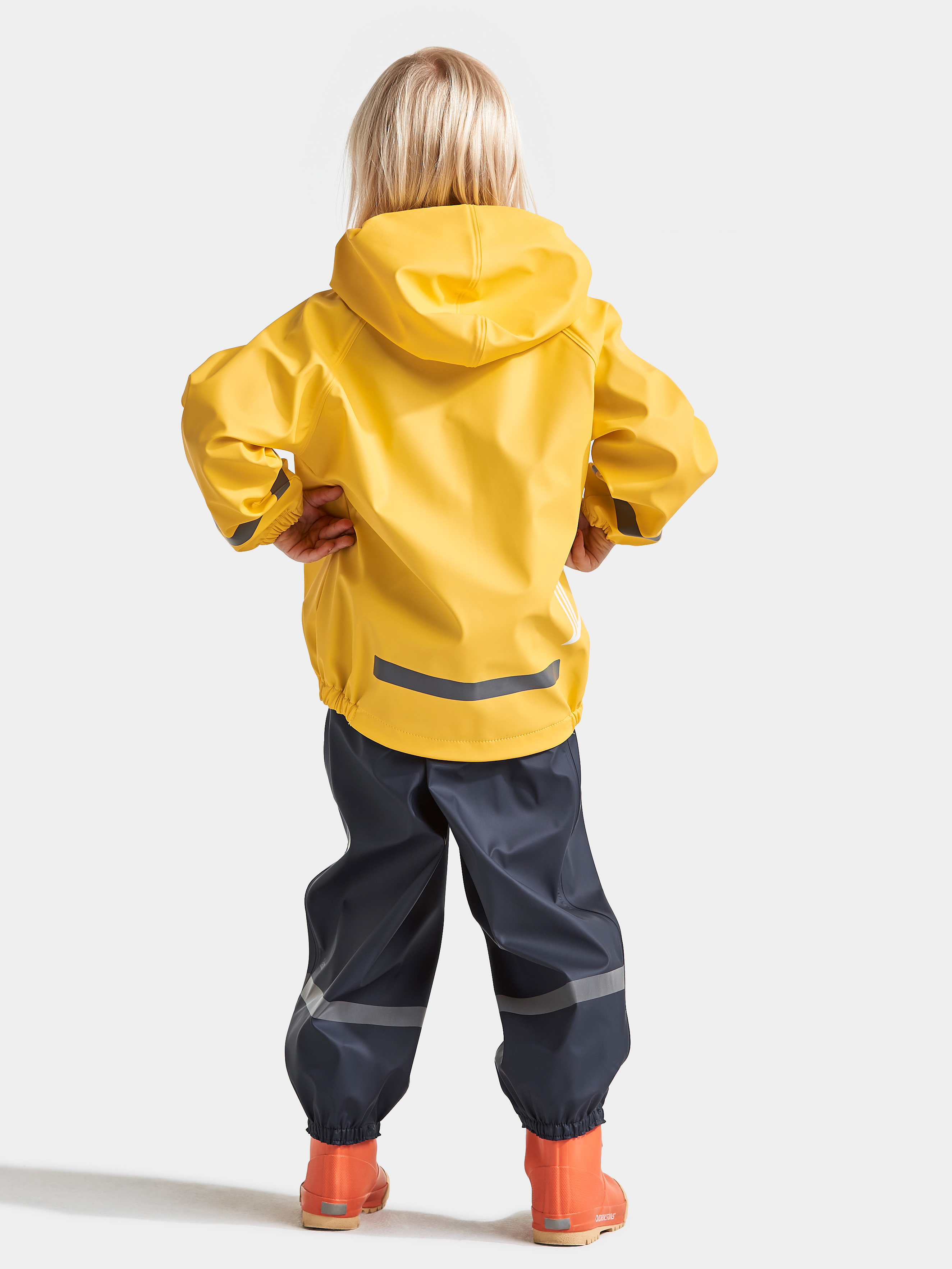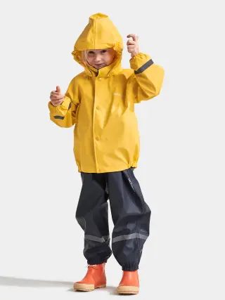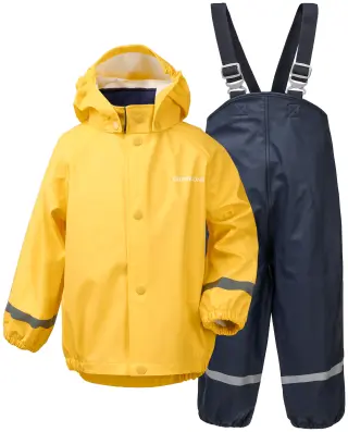 Slaskeman is a 100% wind and waterproof rain suit with welded seams. The rain jacket has press buttons, a detachable hood and visible reflective details throughout the front. Elastic cuffs and raglan sleeves guarantee the best possible freedom of movement. The inside of the collar is made of soft fleece and the sides of the hem have elastic that reduces the risk of the jacket rising up. Rain pants are a high bib model. They are adjusted with push buttons on the sides. They also have adjustable straps. The leg openings have elastic and adjustable and interchangeable leg loops.