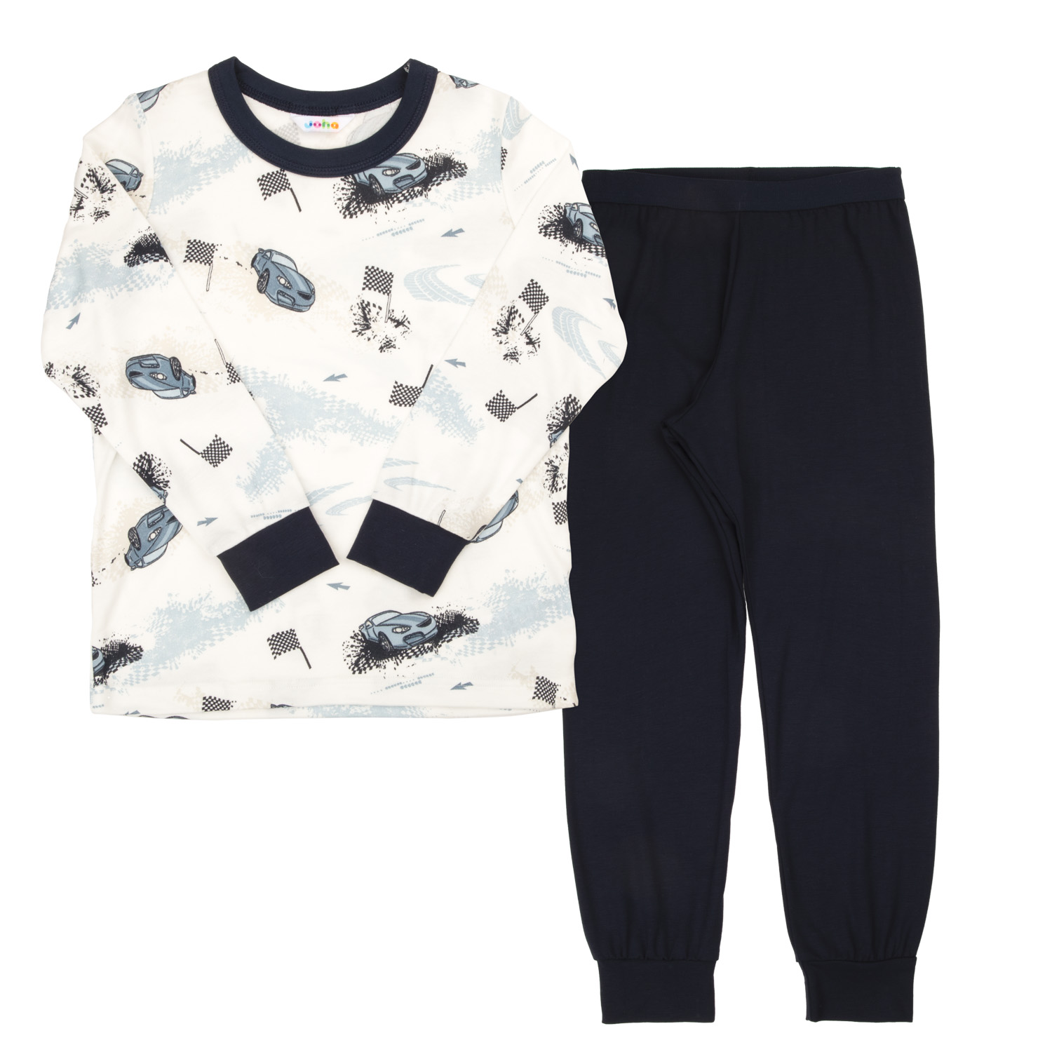 Joha’s cute race car-themed pajama set. The set includes a long-sleeved top with a print and solid-colored pants. The long-sleeved top is decorated with race car illustrations and checkered flags. The pants are solid dark blue with an elastic waistband and gathered cuffs. The pajama is made entirely of bamboo viscose, ensuring breathability and comfort against the skin.