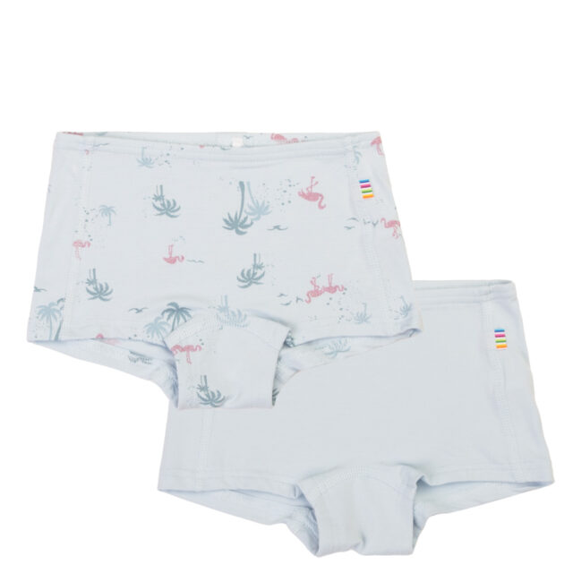 Joha hipster-style underwear with a cute print. The set includes two pairs of pastel-colored underwear: one with a design featuring flamingos, and the other in solid light blue. Joha underwear is breathable and comfortable to wear thanks to its bamboo material.