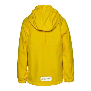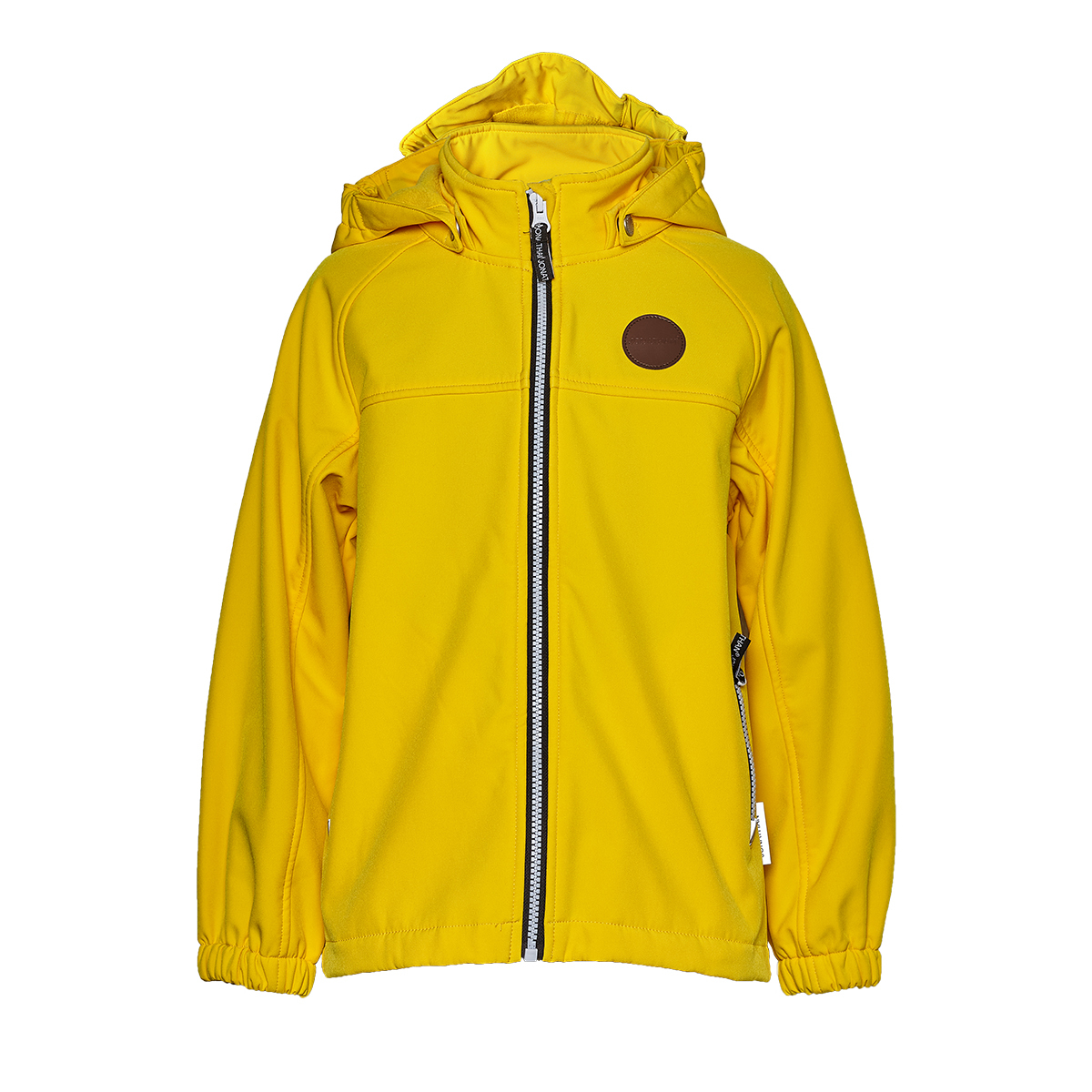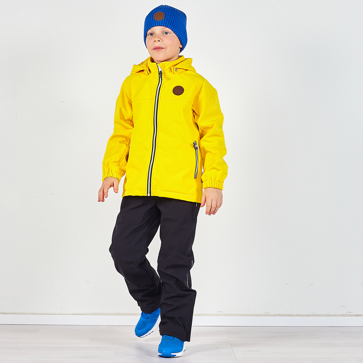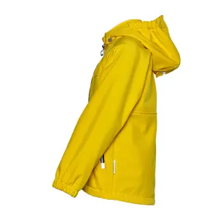 The children's softshell jacket is a cheerful sight in the darker days. This jacket has pleats at back, detatchable safetyhood with a reflecting detail, and zipper pockets to carry the essentials! The multi-functional and sporty jacket features a waterproof and windproof cover material. The fleece layer keeps you just warm enough for comfort. Snap pockets on the front for small treasures.