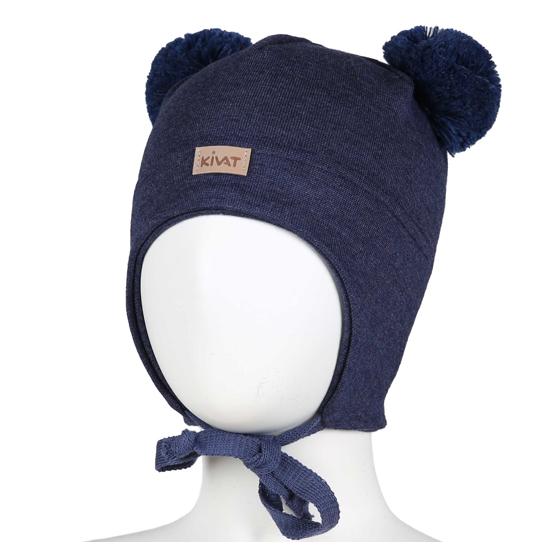 KIVAT beanie with large ball bobbles and KIVAT label in front. Beanie has ear flaps, ties under the chin and wind protection for the ears.