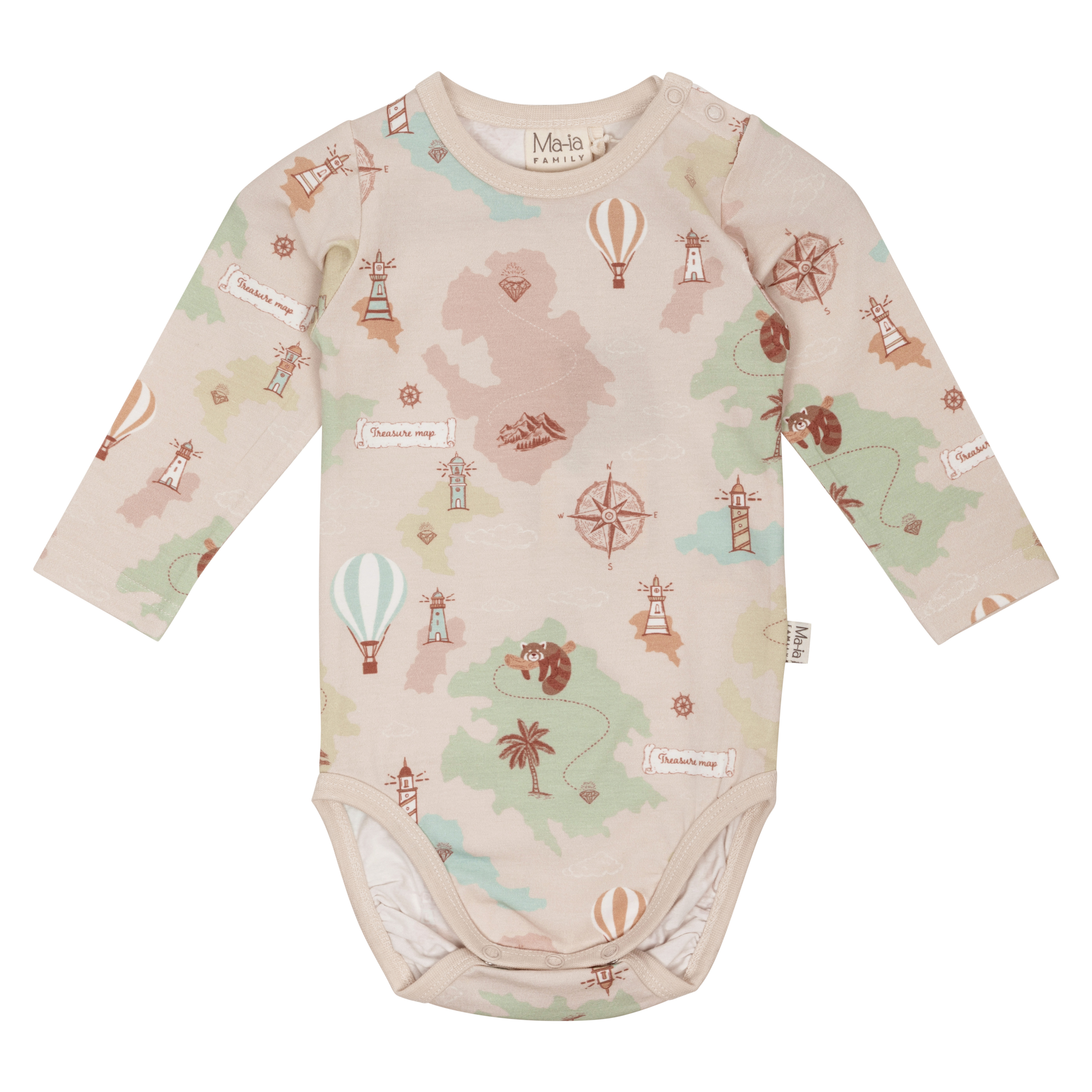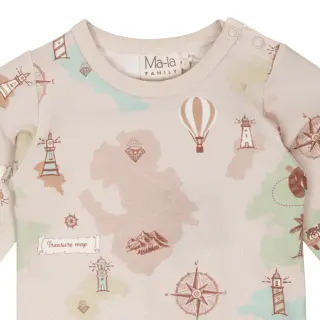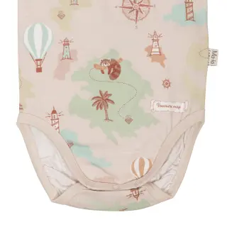A beige baby bodysuit made from a soft organic cotton blend, featuring the delightful Reitti pattern. The bodysuit has long sleeves and snap buttons on one shoulder and at the crotch to make dressing easier. The material feels soft against the skin. Designed in Finland.