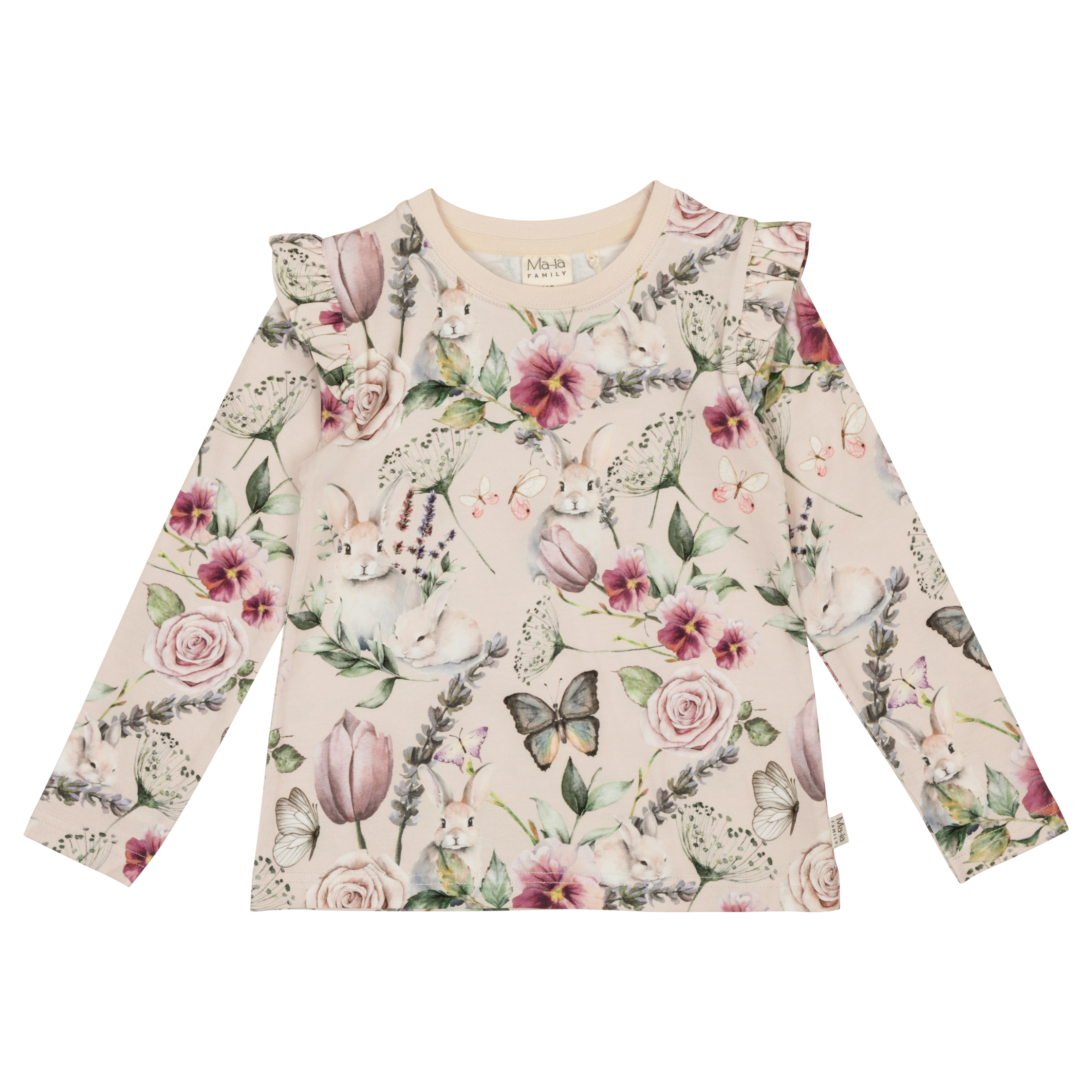 A beige-toned children’s long-sleeved shirt made from a soft organic cotton blend, featuring the beautiful Orvokki pattern. The straight-cut shirt has long sleeves, a round neckline, and charming frill details on the shoulders. Designed in Finland.