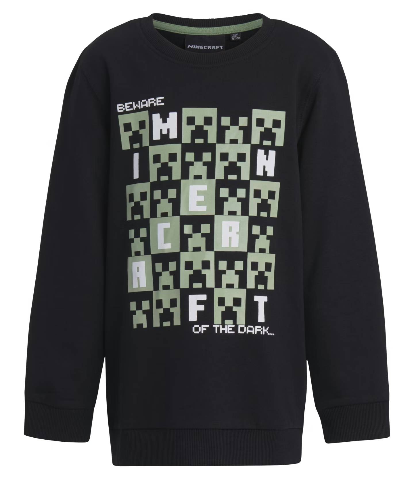 The iconic Creeper character from the Minecraft game is featured on this stylish black sweatshirt. The front showcases a print of the well-known nighttime enemy Creeper along with the text “Beware of the dark...” in the game’s signature pixel style. The sweatshirt is pleasantly soft, and the ribbed cuffs enhance both comfort and the overall polished look.