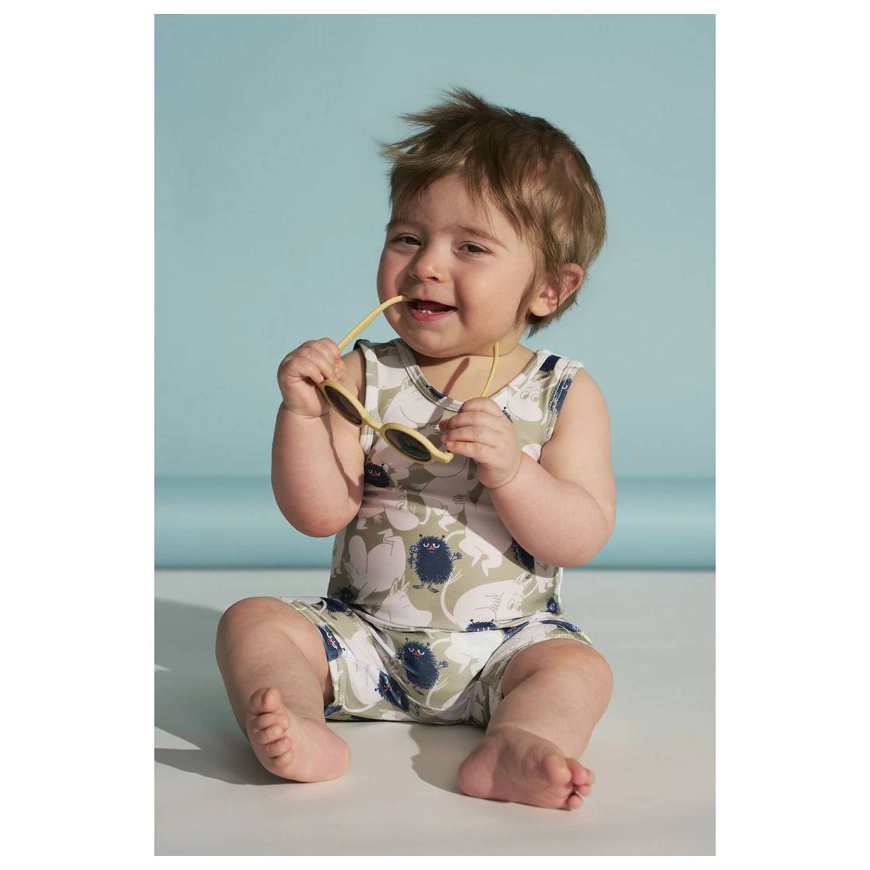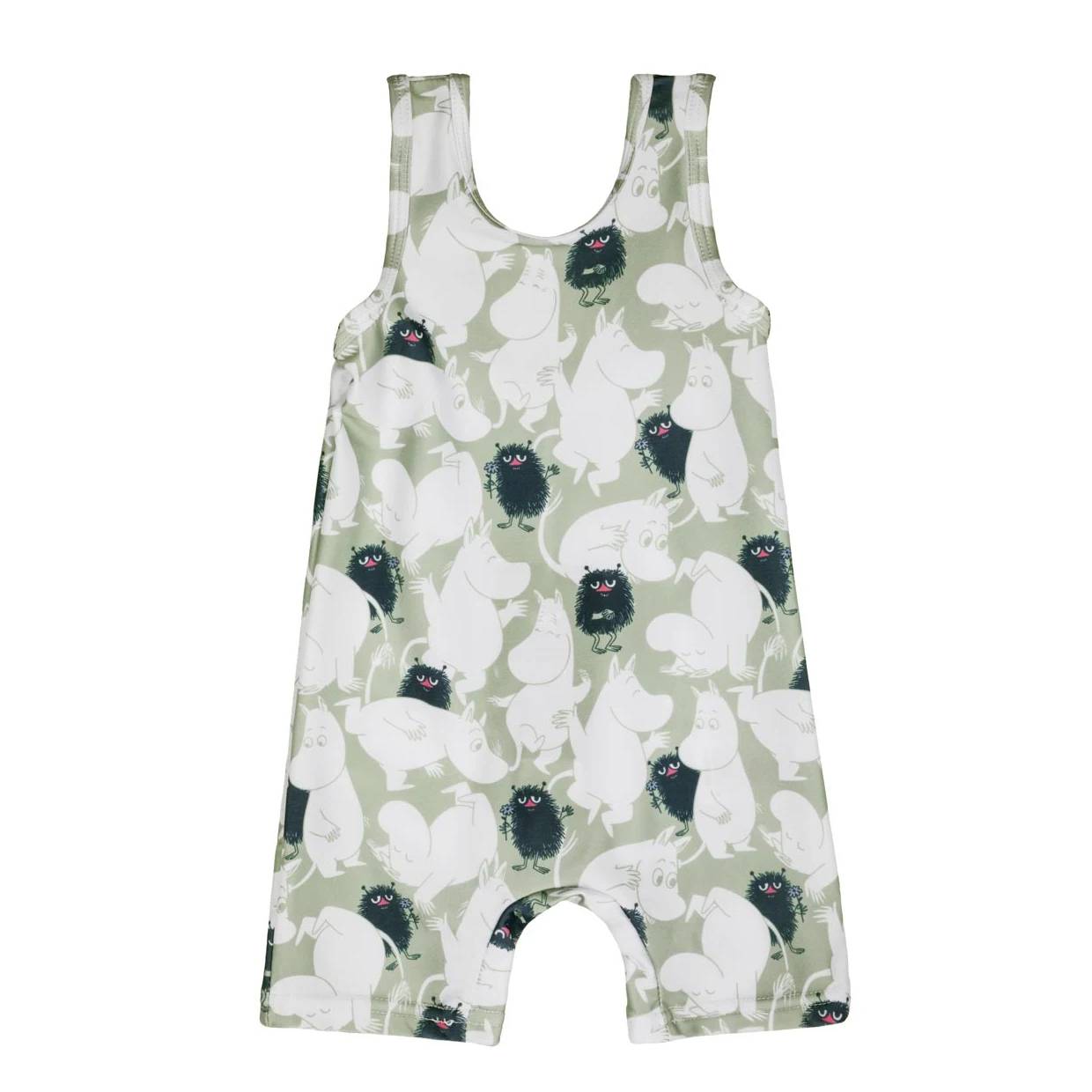 Green-coloured Moomin swimsuit for babies with wide straps, short inseams and the joyous Wild Stinky print.
