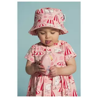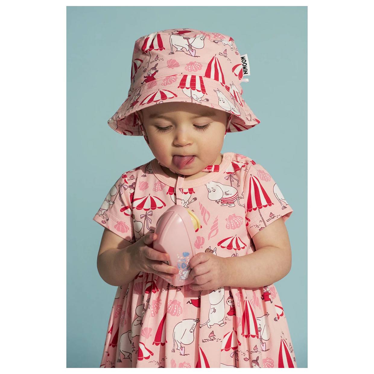 Soft children’s sun hat featuring a playful Moomin-themed Shell Beach pattern. The hat has a wide brim to protect the face and neck from the sun, along with tie straps to ensure a secure fit.