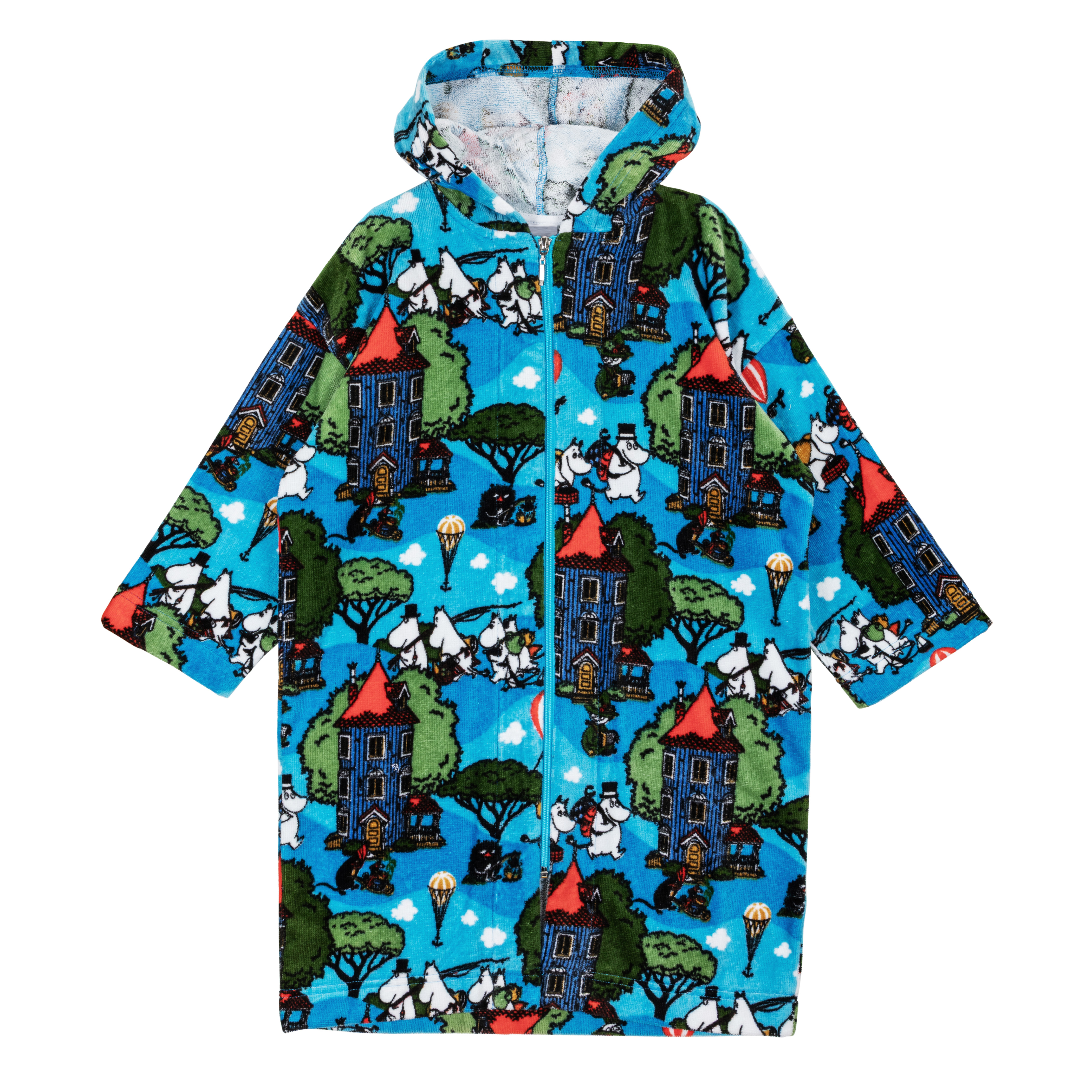 Blue children’s long-sleeved bathrobe has a comfortable fit, hood, and a zipper. The bathrobe features a print of the Moominhouse and its yard.