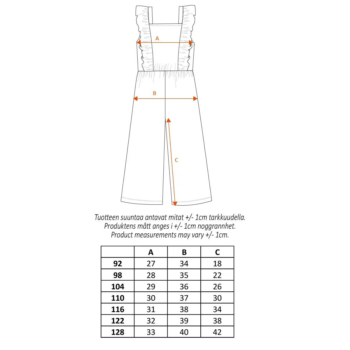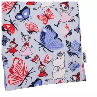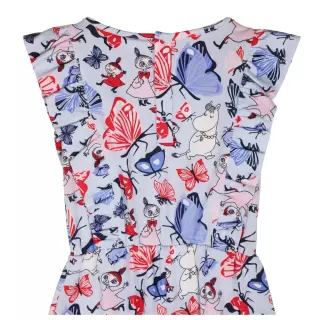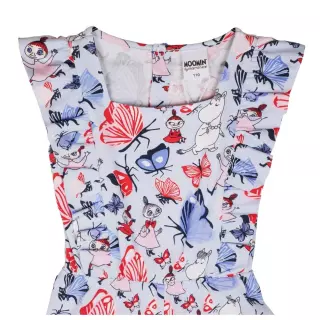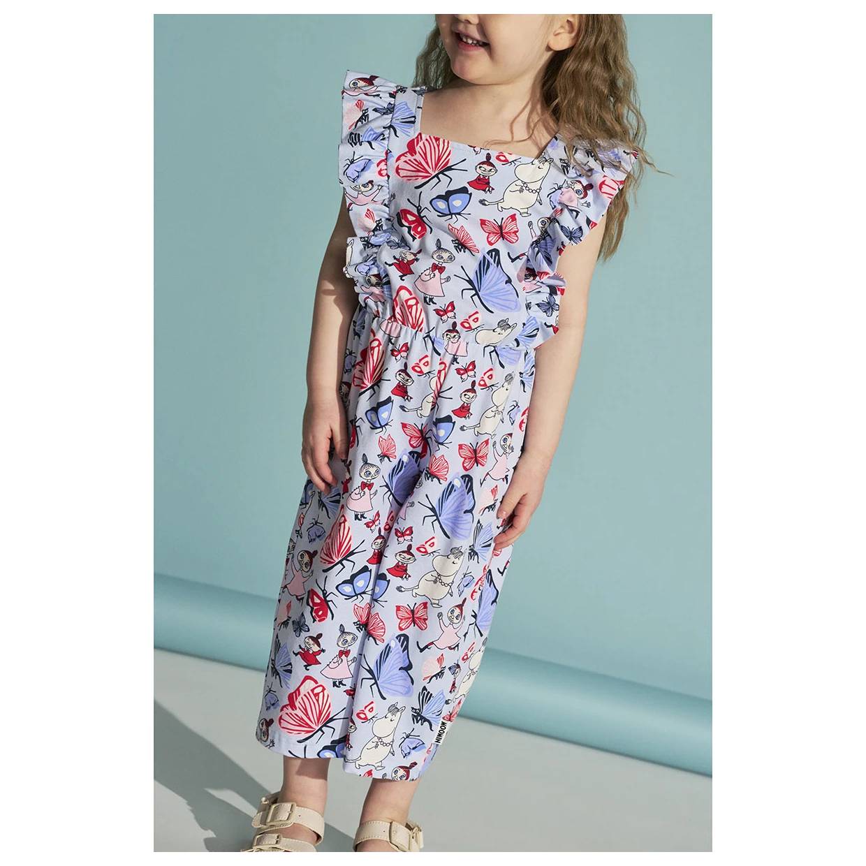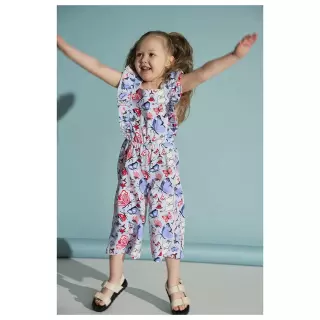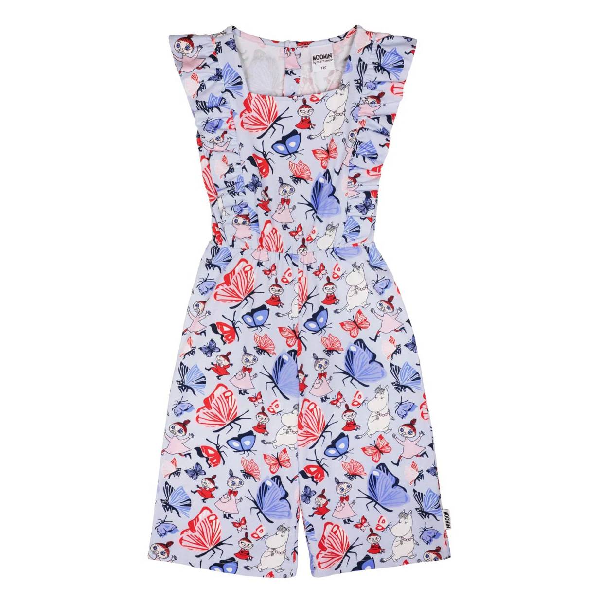 Moomin overall with adorable shoulder frills, a square neckline and capri-length, wide legs. The capri romper has the adorable Butterfly Park print.