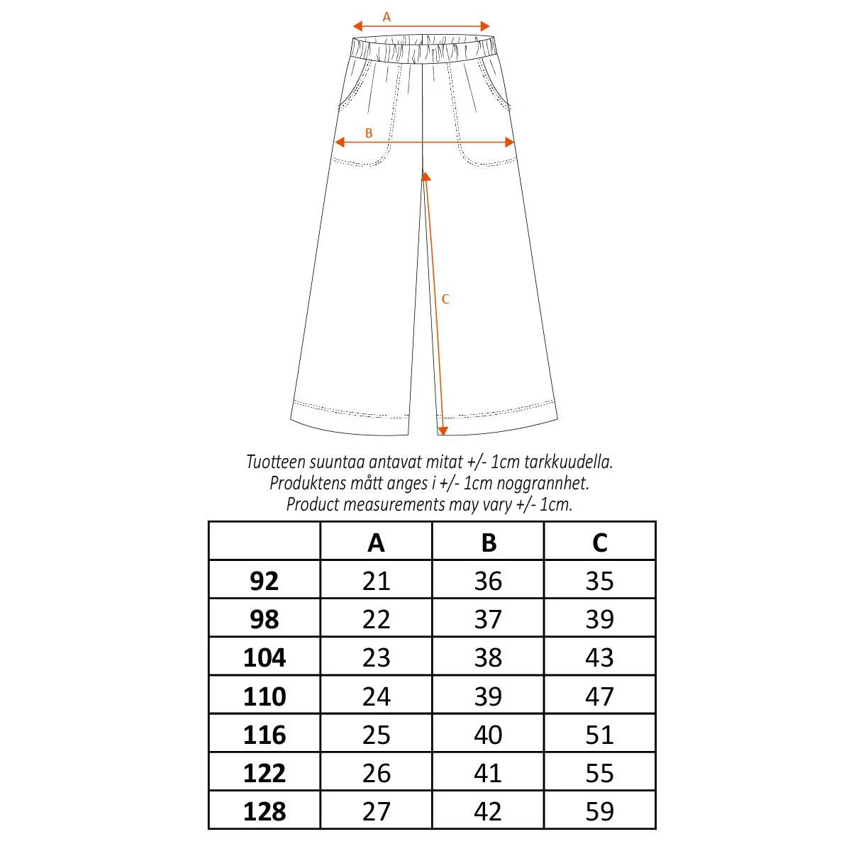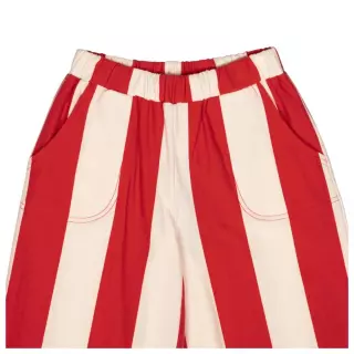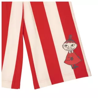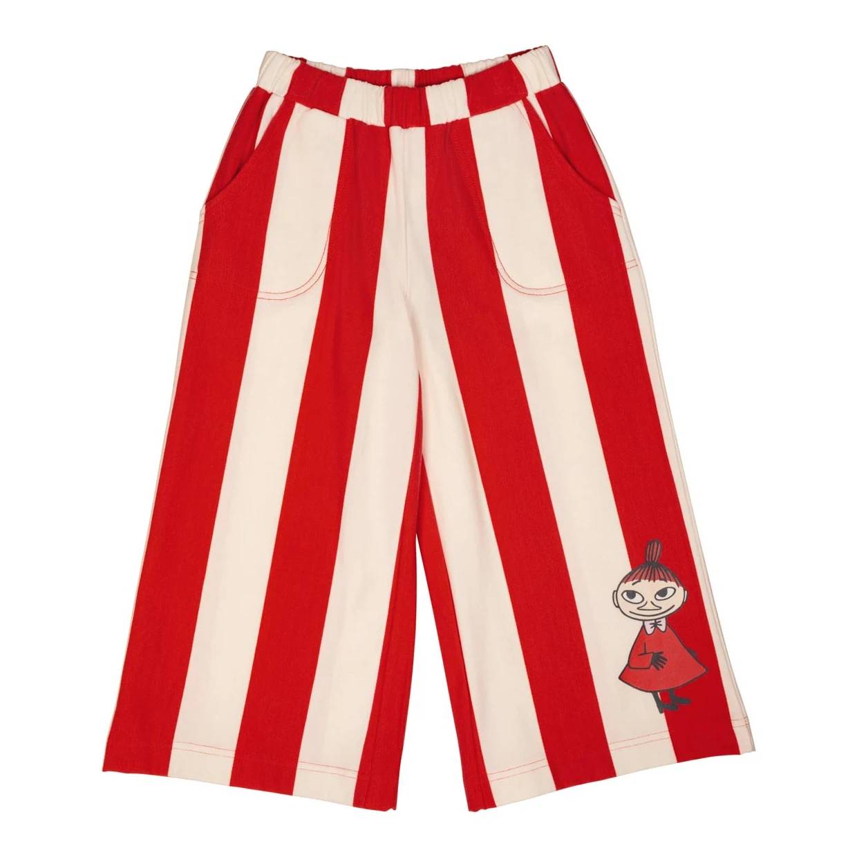 Soft striped Moomin-themed culottes for children, perfect for everyday wear. The trousers feature wide legs, an elastic waistband, and pockets with decorative stitching. They are made from a woven cotton blend. The red and white striped design and picture of Little My gives a fresh and striking look.