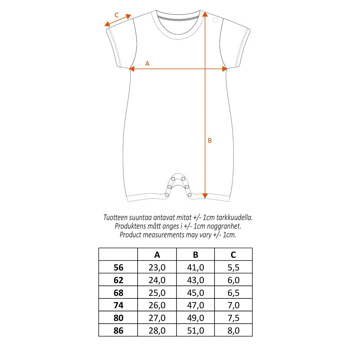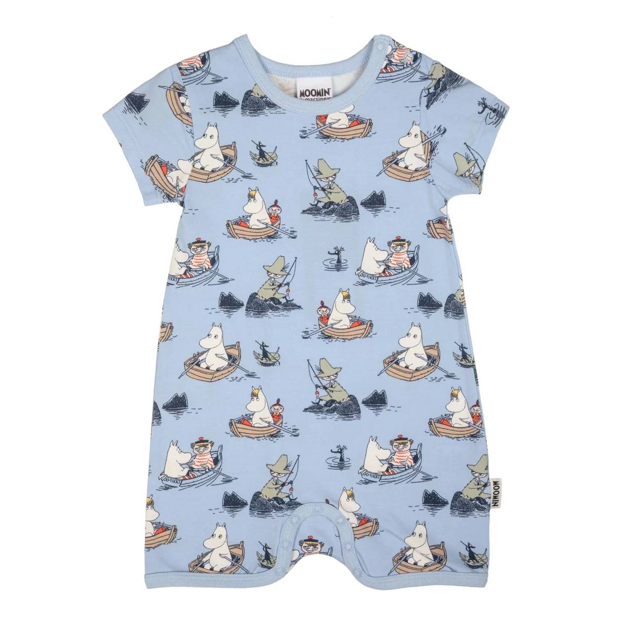 Babies’ soft pale blue Moomin-themed playsuit features the serene Boaters print. The short-sleeved playsuit has short legs and snap buttons on one shoulder to help with getting dressed. There are buttons in the crotch for diaper changing.