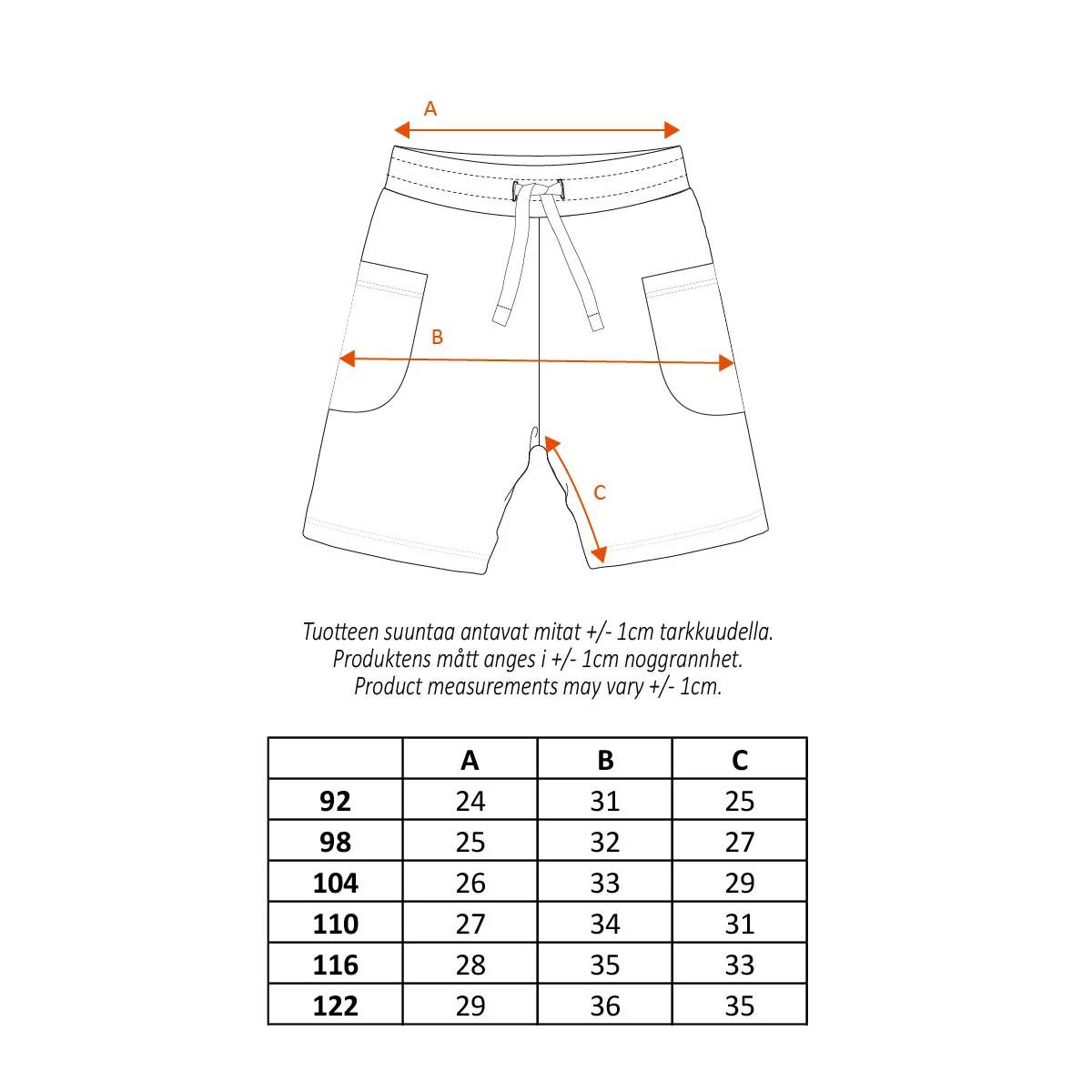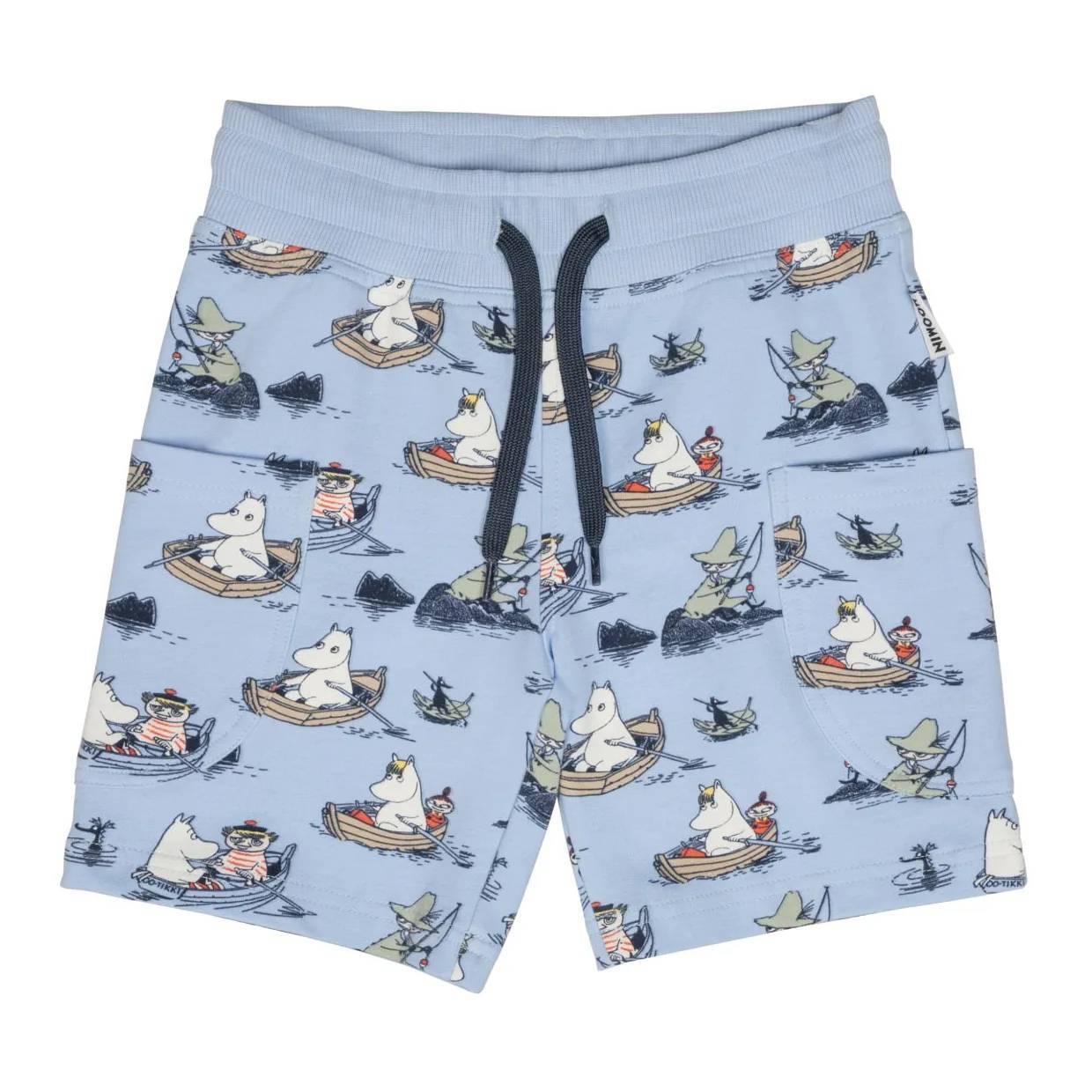 Soft Moomin-themed shorts for children featuring a calm Boaters print. The shorts have a drawstring waistband and practical side patch pockets. An all-over print showcases Moominvalley characters on a light blue background.