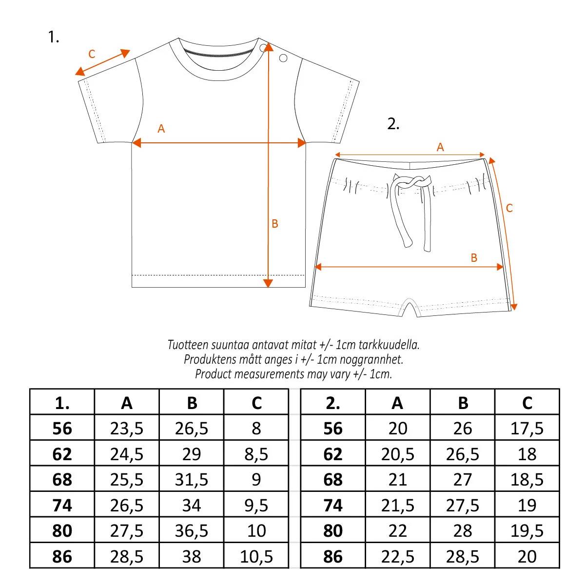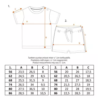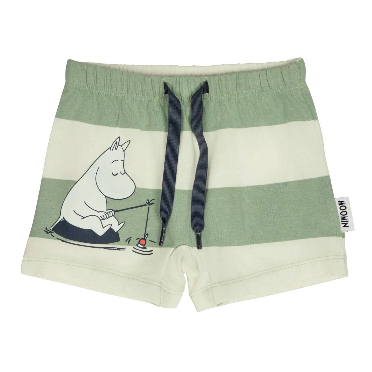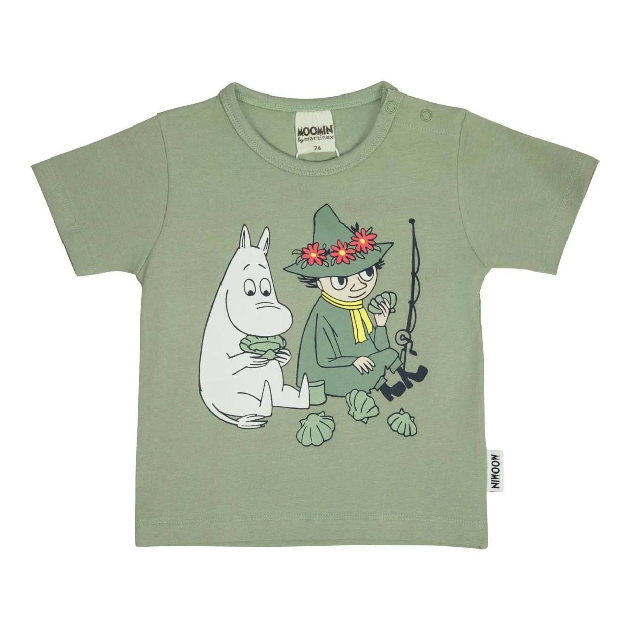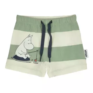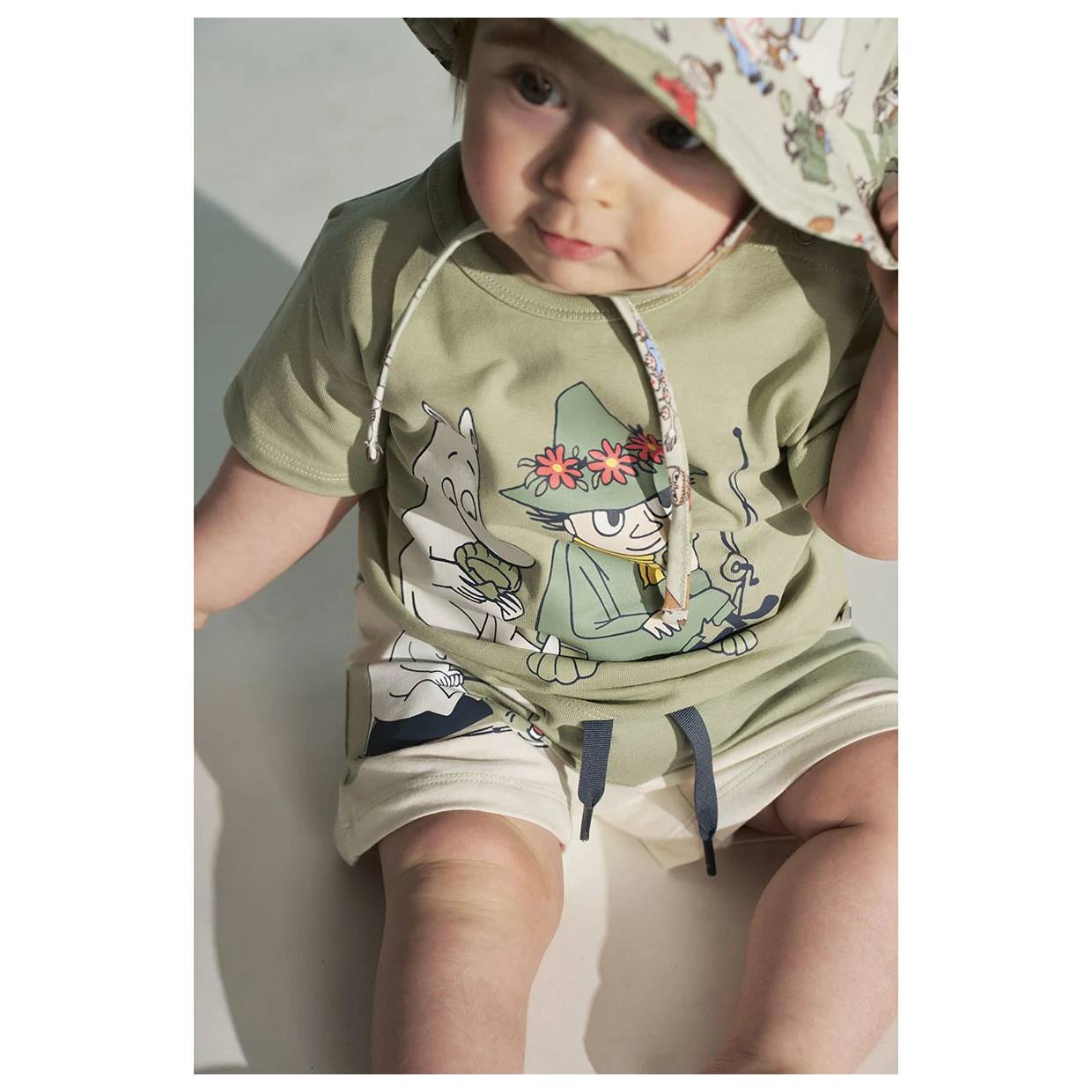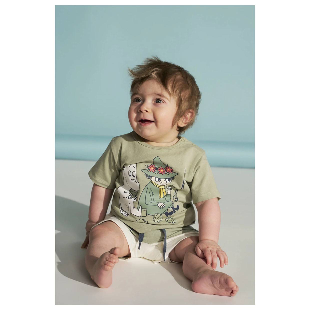 Adorable Moomin Day off shorts set, including a T-shirt and shorts. The T-shirt features a Moomin and Snufkin print, while the shorts are decorated with a Moomin pattern. The T-shirt has snap buttons on the shoulder for easy dressing. The shorts have drawstrings and an elastic waistband, with enough room to comfortably fit a diaper. Made from pleasantly soft organic cotton jersey.