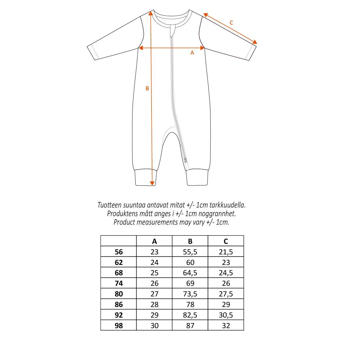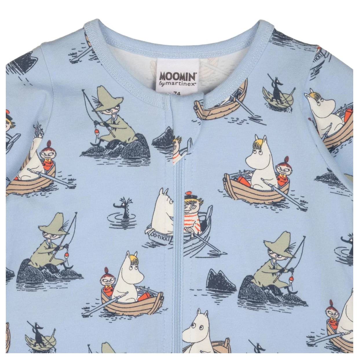 Babies’ soft light blue Moomin-themed pyjama features the serene Boaters print. The long-sleeved pyjama has leg cuffs and a long two-way zipper that helps with getting dressed.