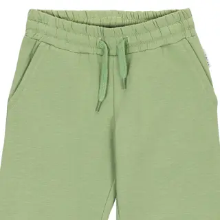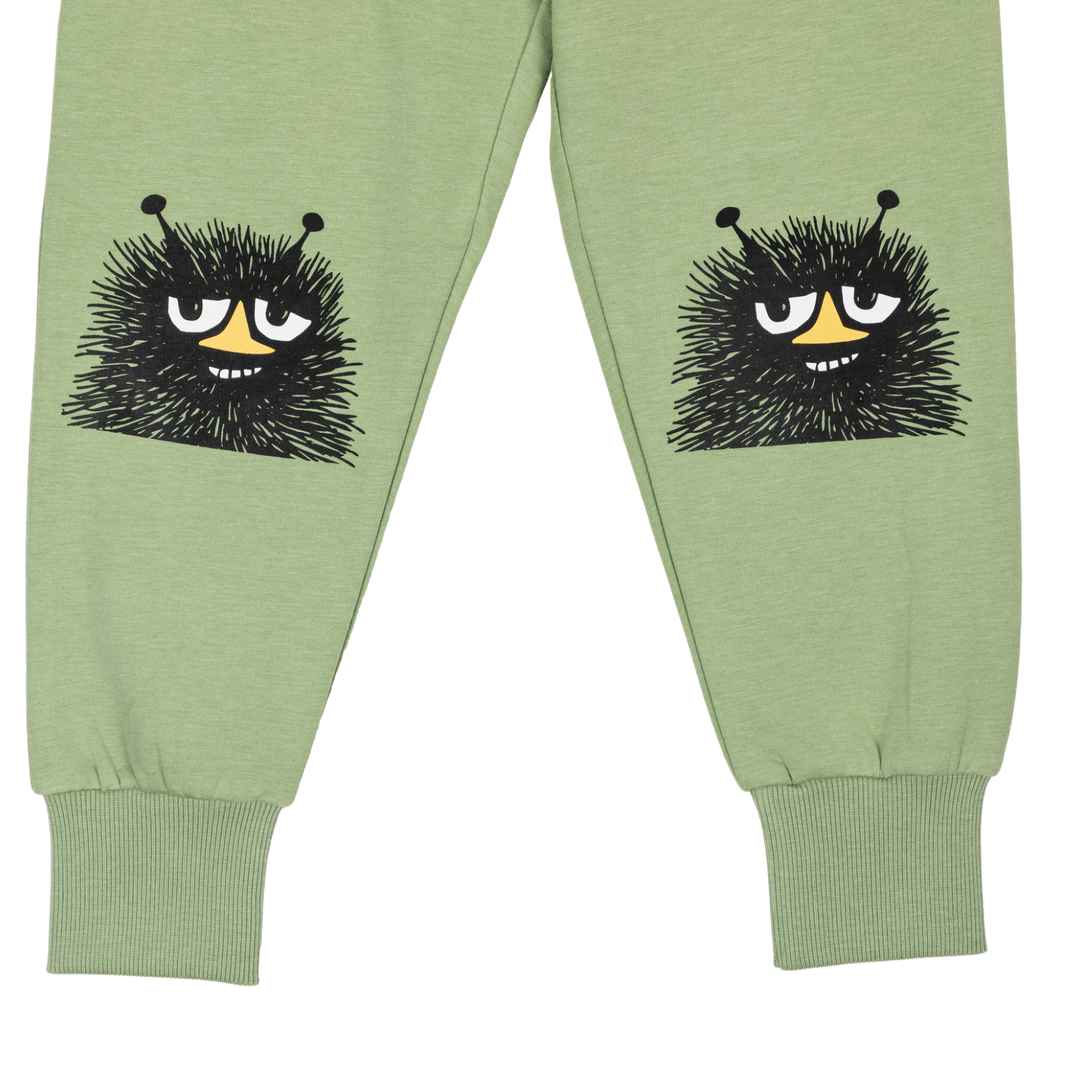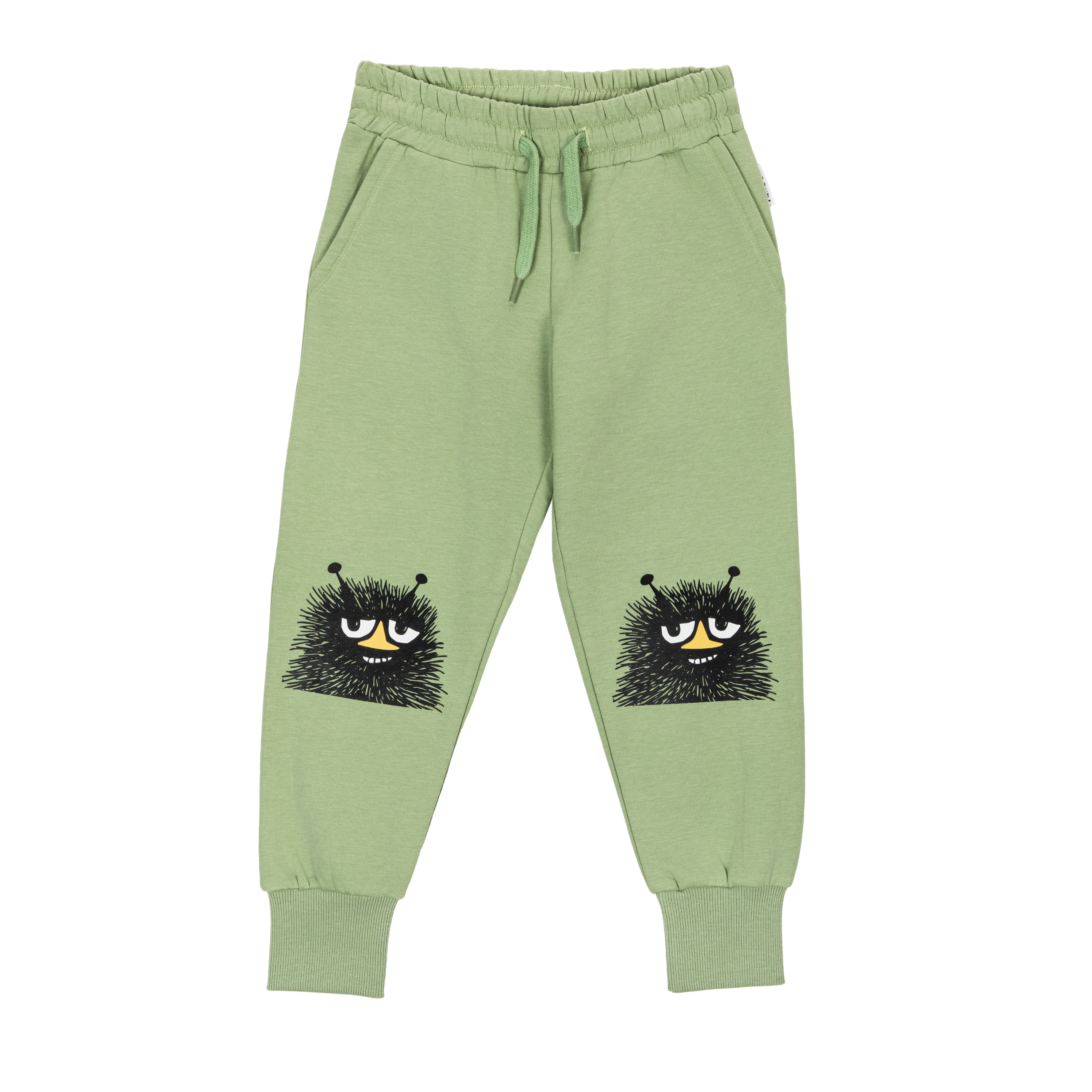 Playful, green colored children's Moomin sweatpants have an elastic waistband with a drawstring and elastic leg ends for best everyday comfort. There is a happy Hey Stinky print on both legs. The trousers are made from soft, brushed French cotton. Designed in Finland.