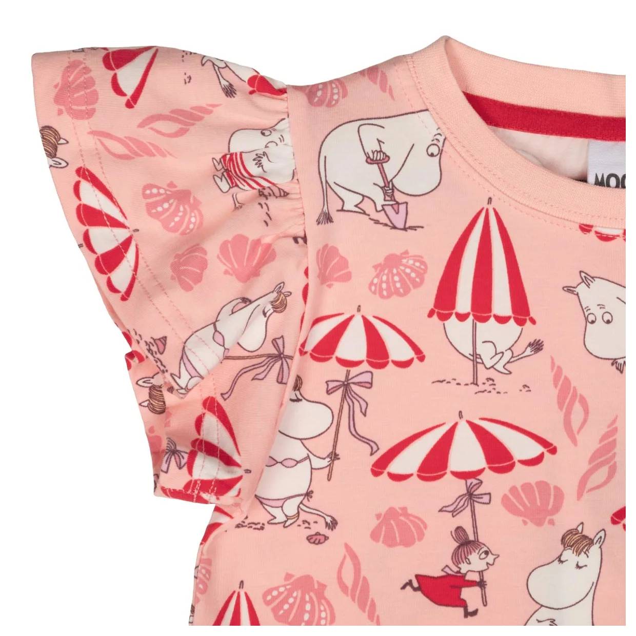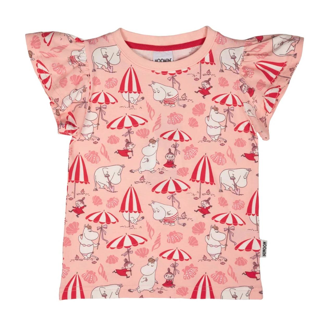 Soft children’s Moomin-themed T-shirt with a playful Shell Beach pattern. The T-shirt has short ruffle sleeves and a round neckline. The color is coral, and the print shows Moomintroll, Little My, and Snorkmaiden playing on the beach.