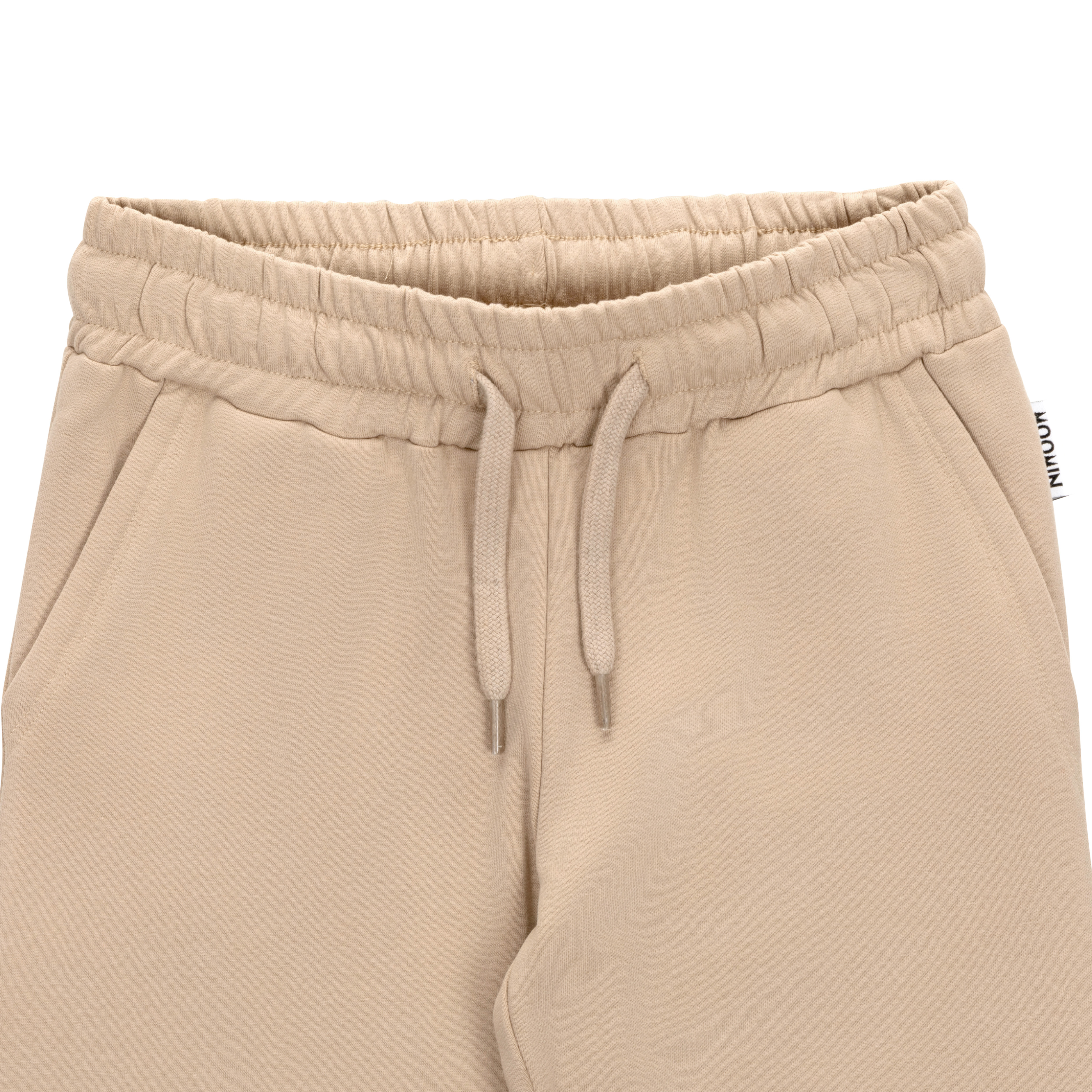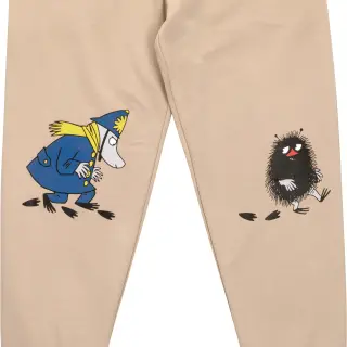 Beige children’s full-length college have slant pockets on the sides, an elastic waistline with a drawstring, cuffs, and they are brushed soft on the inside. On the knees are happy prints of Stinky.