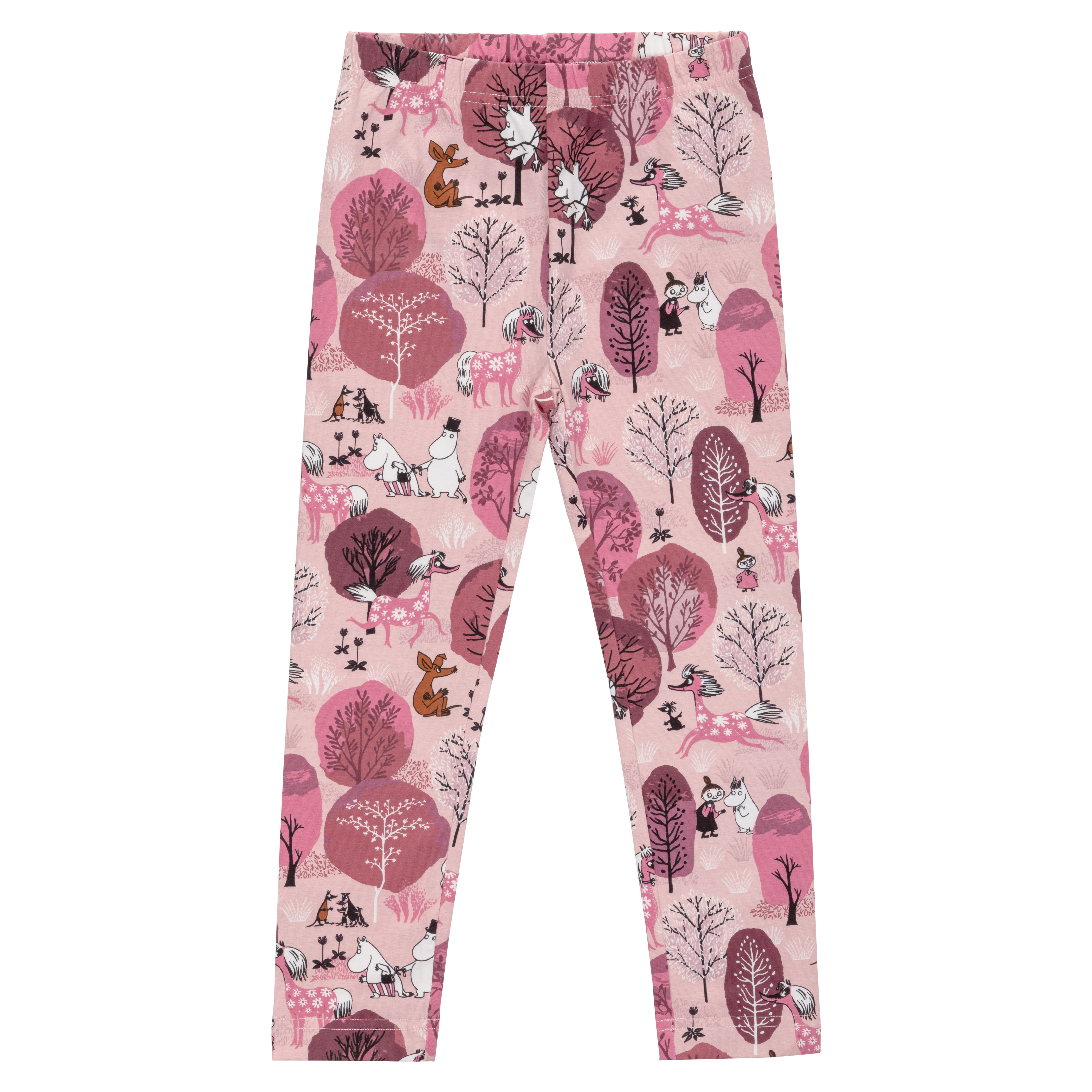 Light pink children’s full-length leggings have an elastic waistline, and they feature the delicate Whispering print.