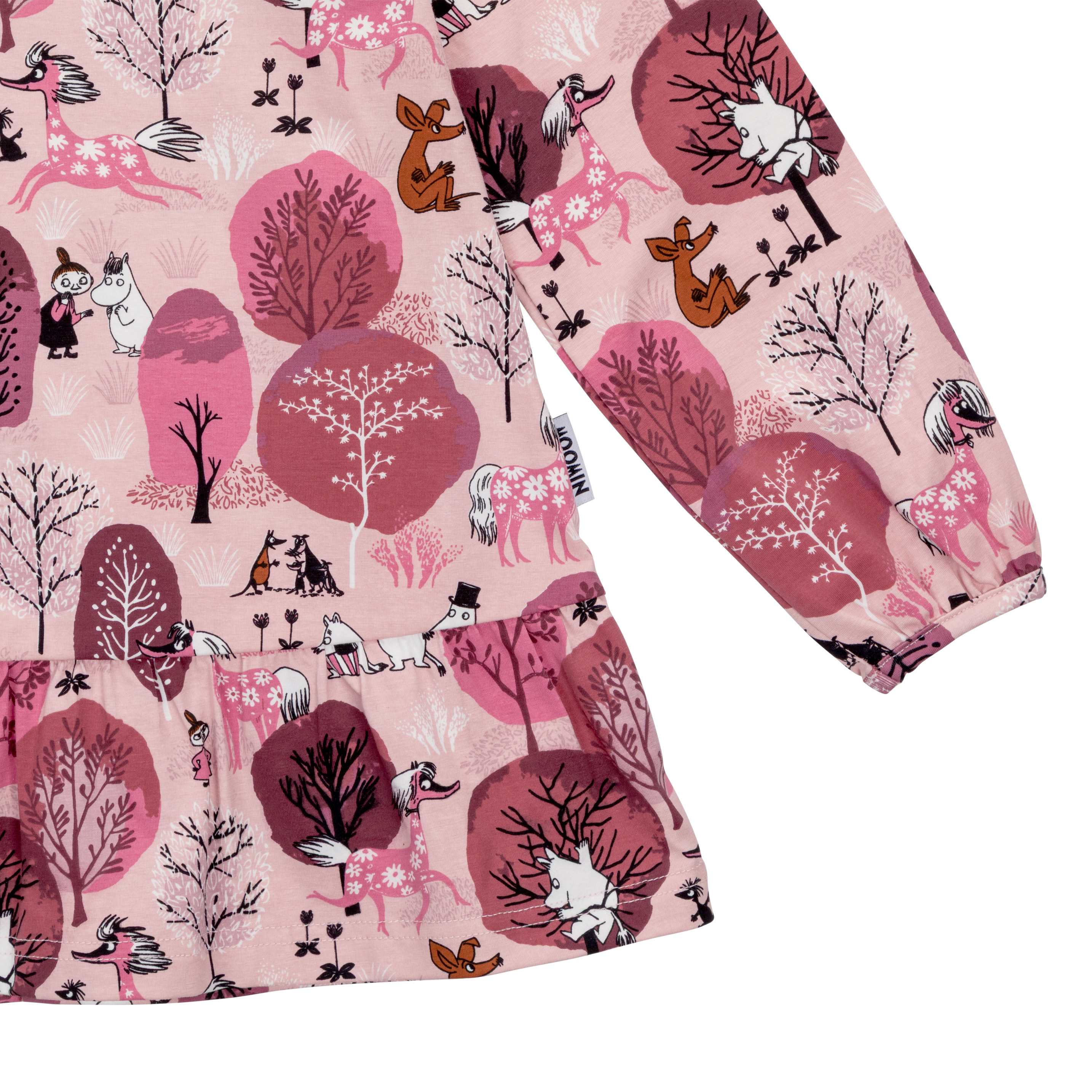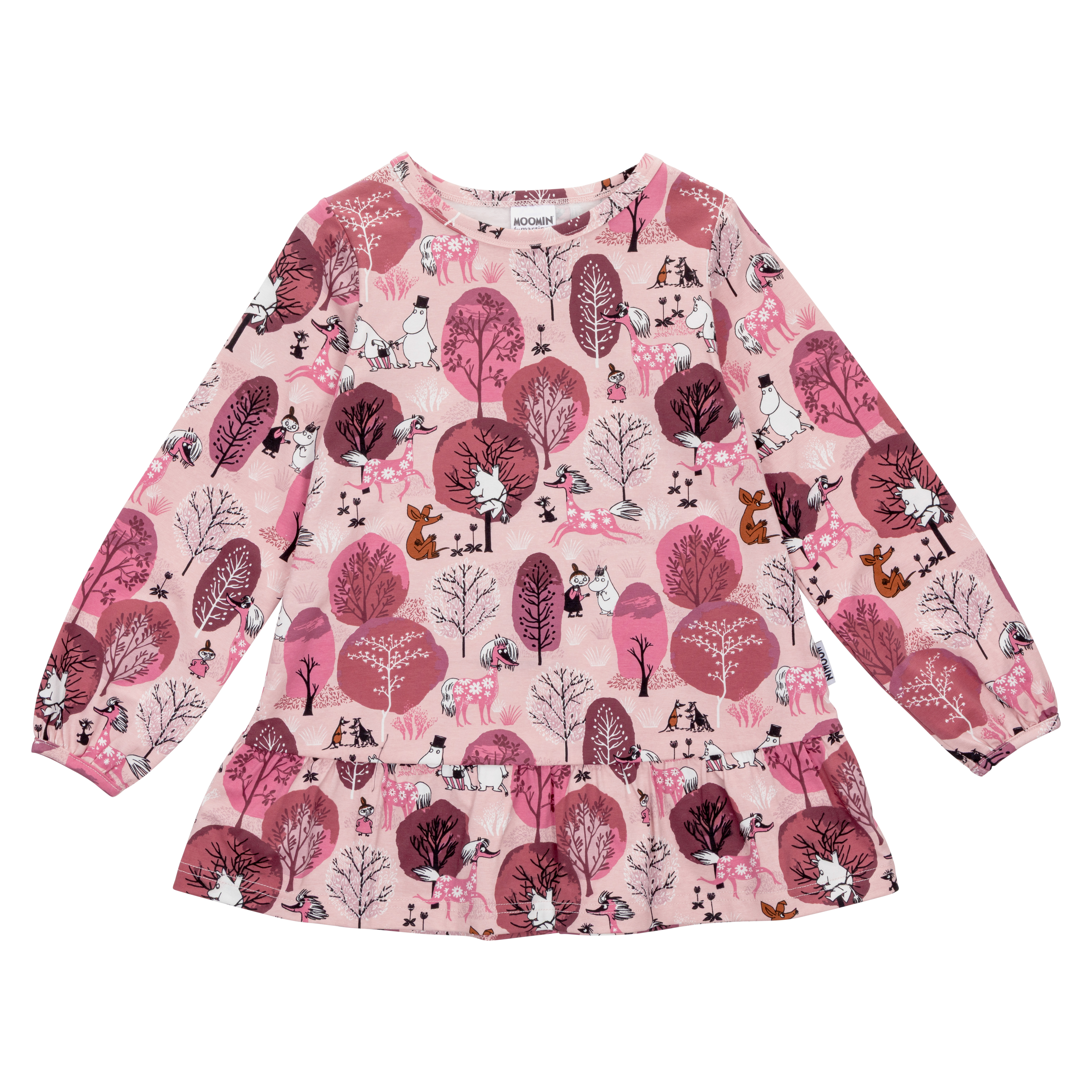 Pink children’s long-sleeved tunic has a comfortable A line cut, well-draping sleeves, and a hem with a frill. The tunic features the delicate Whispering print.