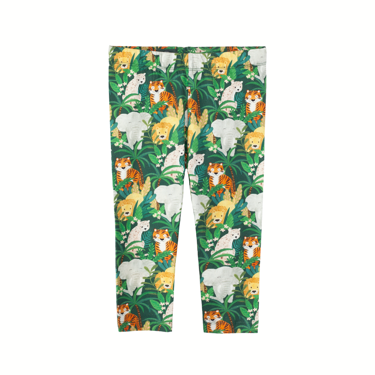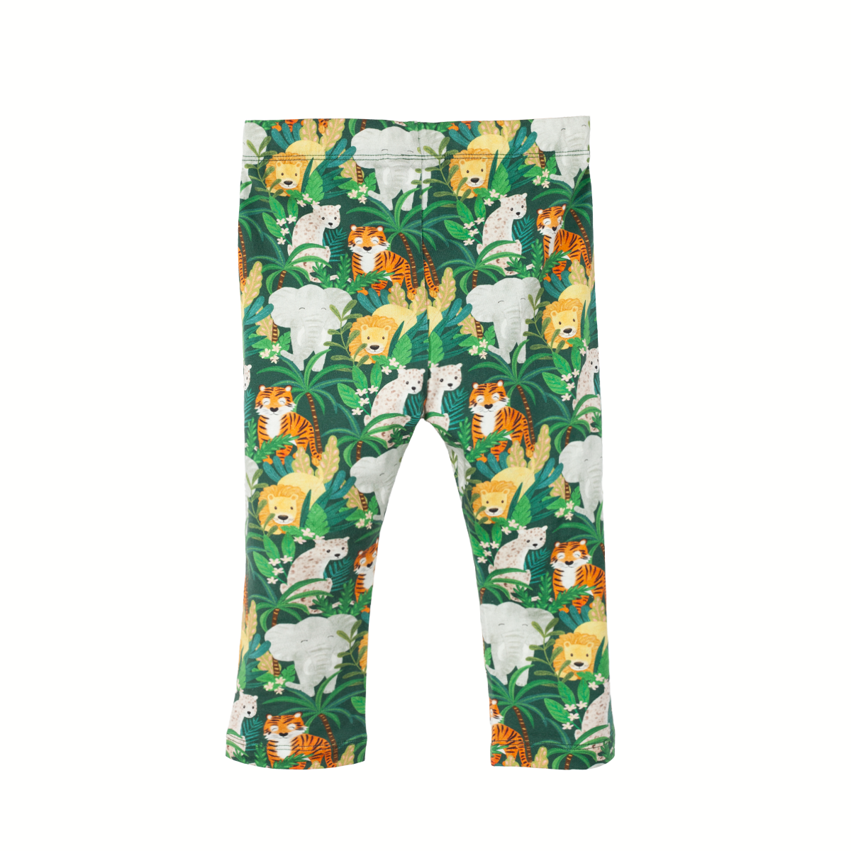 Made from soft organic cotton, these leggings feel gentle and comfortable on the skin. The charming jungle print adds a fun detail to any outfit. They also feature an elastic waistband that provides a snug fit without feeling tight.