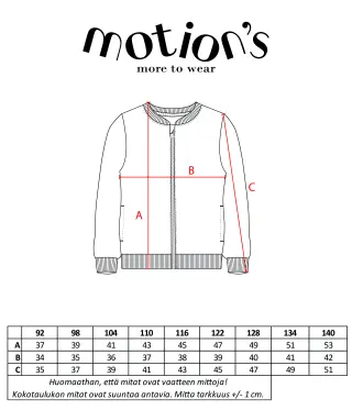 Motion's jacket is a perfect choice for everyday wear! The material of the jacket is soft organic cotton that is fully brushed from the reverse side which feels comfortable against the skin. The jacket has a zipper and low ribbed collar. Create a comfortable, playful outfit by pairing this jacket with Motion's college trousers.