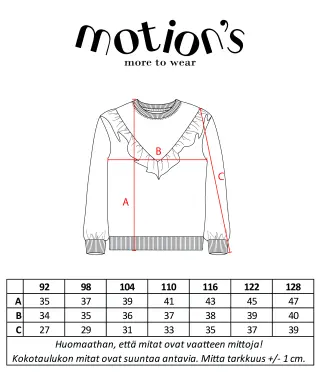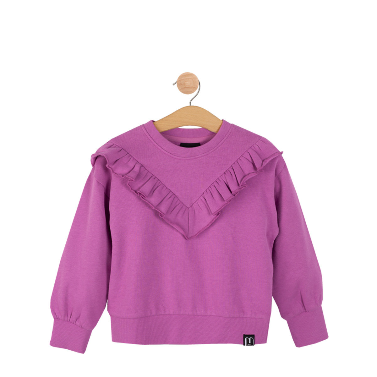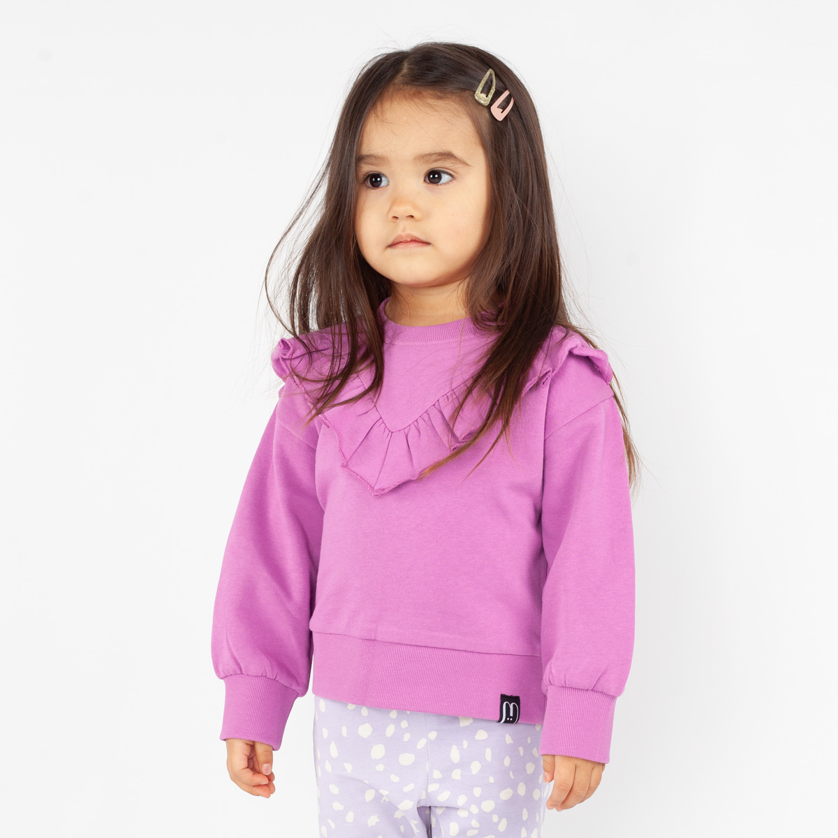 This Motion's pullover shirt has adorable ruffles on the front! The material of the pullover is soft organic cotton that is fully brushed from reverse side which feels comfortable against the skin. Create a comfortable, playful outfit by pairing the pullover with Motion's leggings.