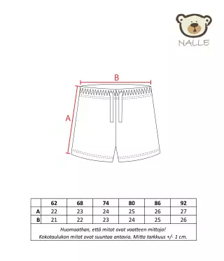 Nalle shorts are a practical option for your baby's wardrobe. These shorts don't have side-seams to make them more comfortable to wear. Faux-strings look stylish, but won't accidentally slip off!