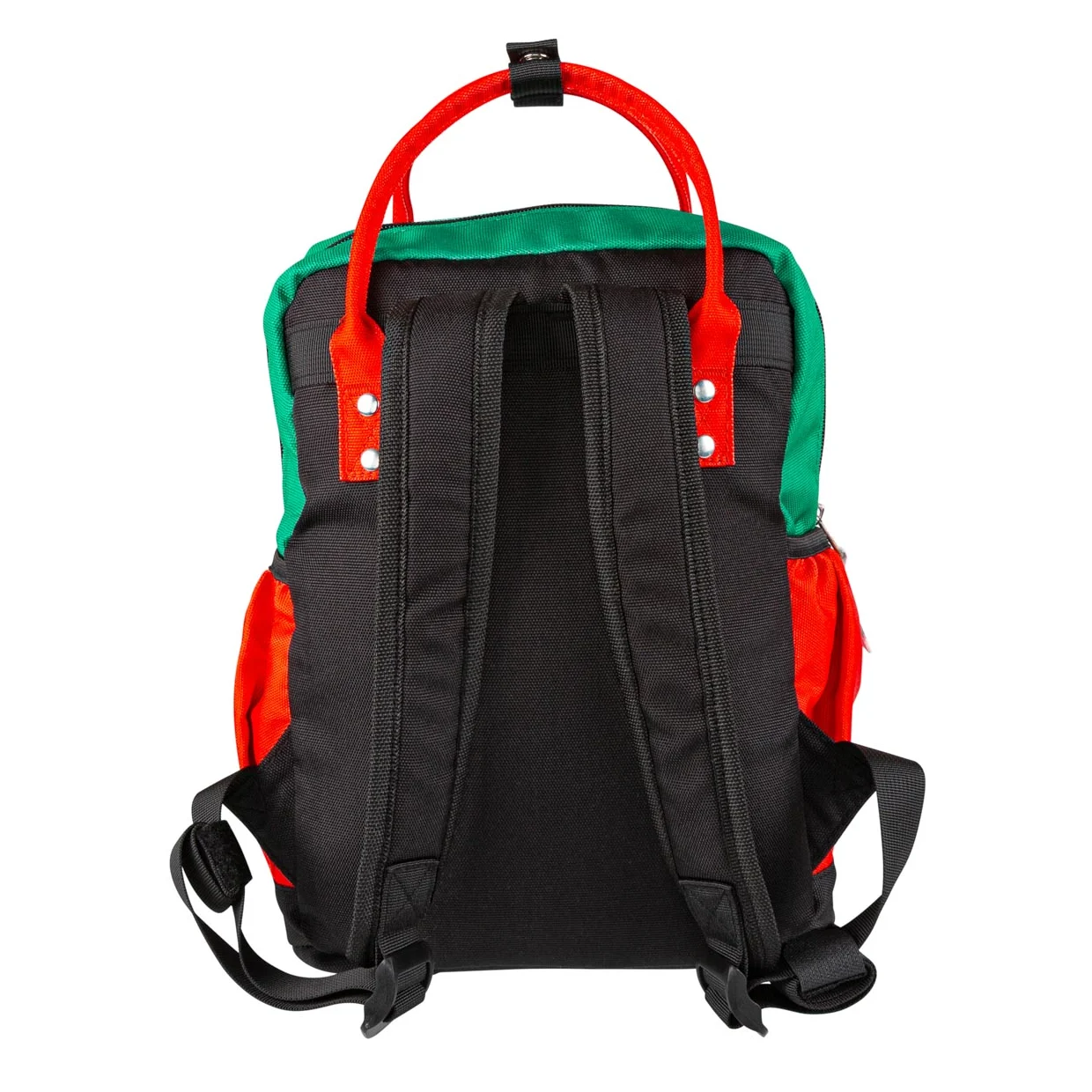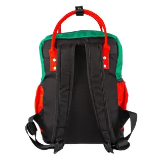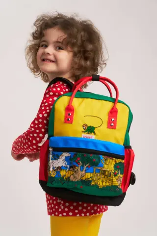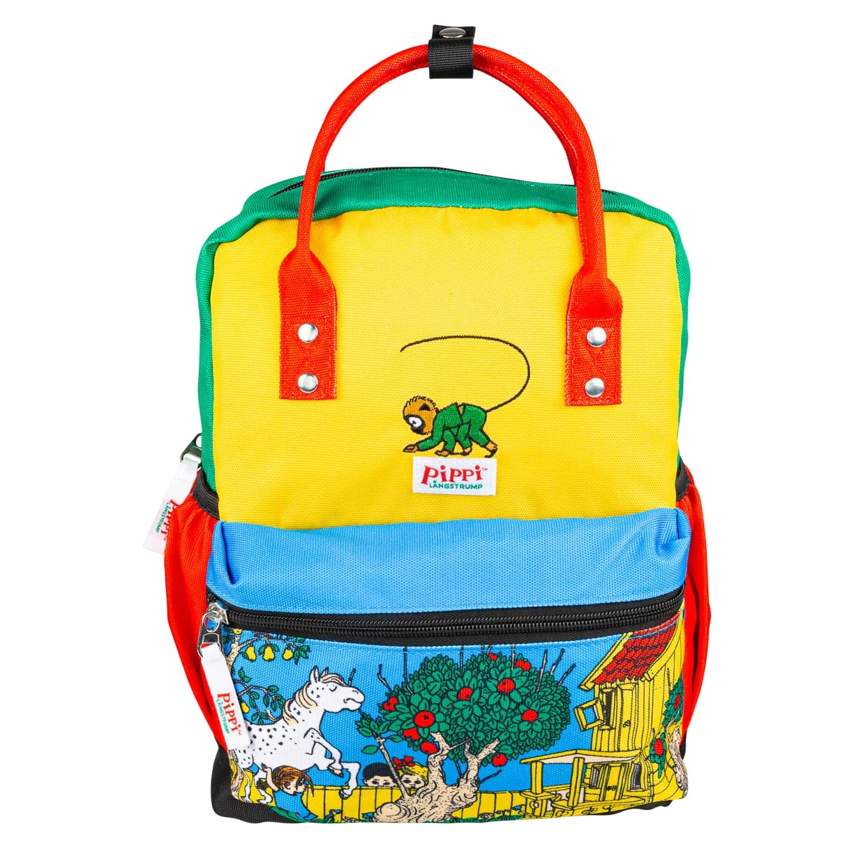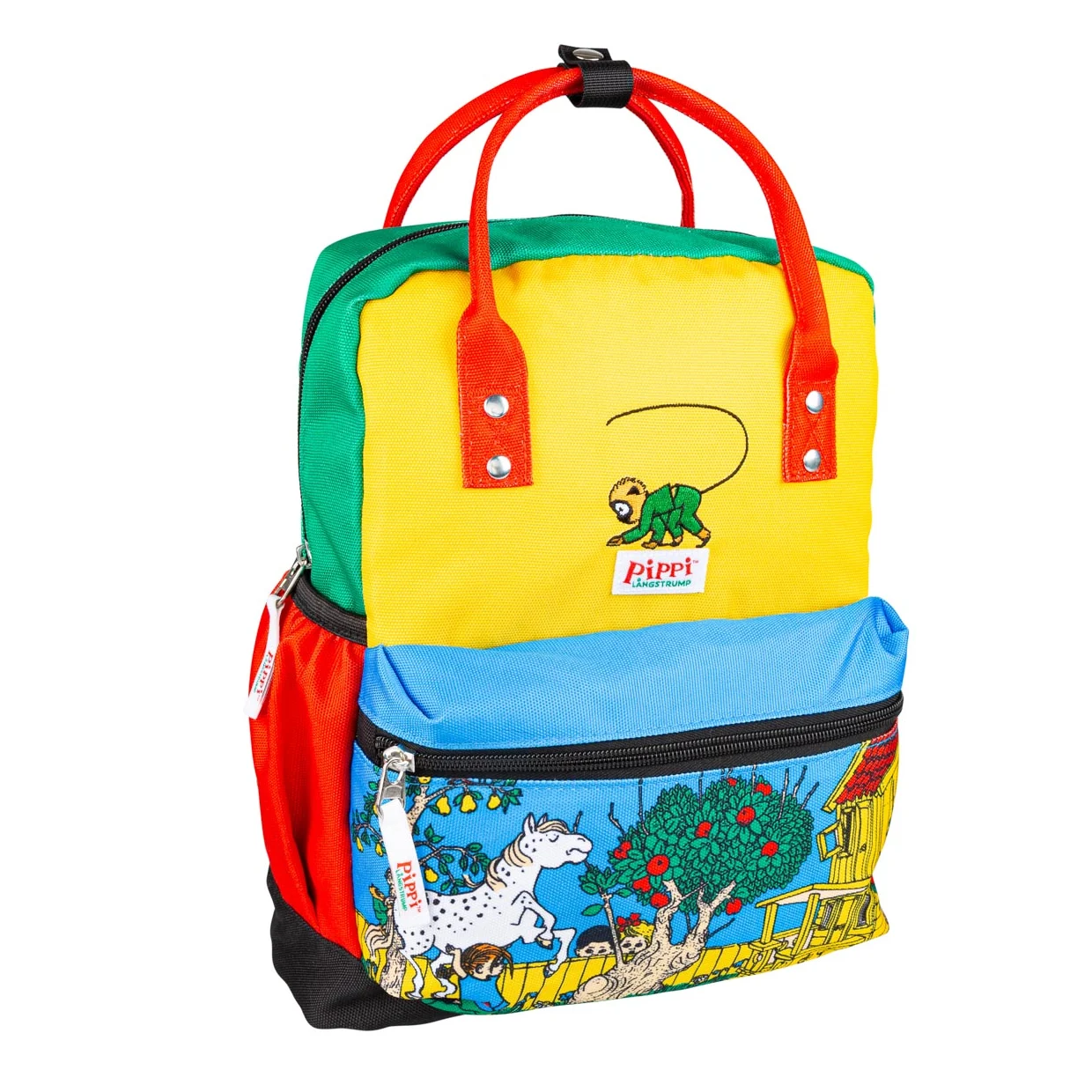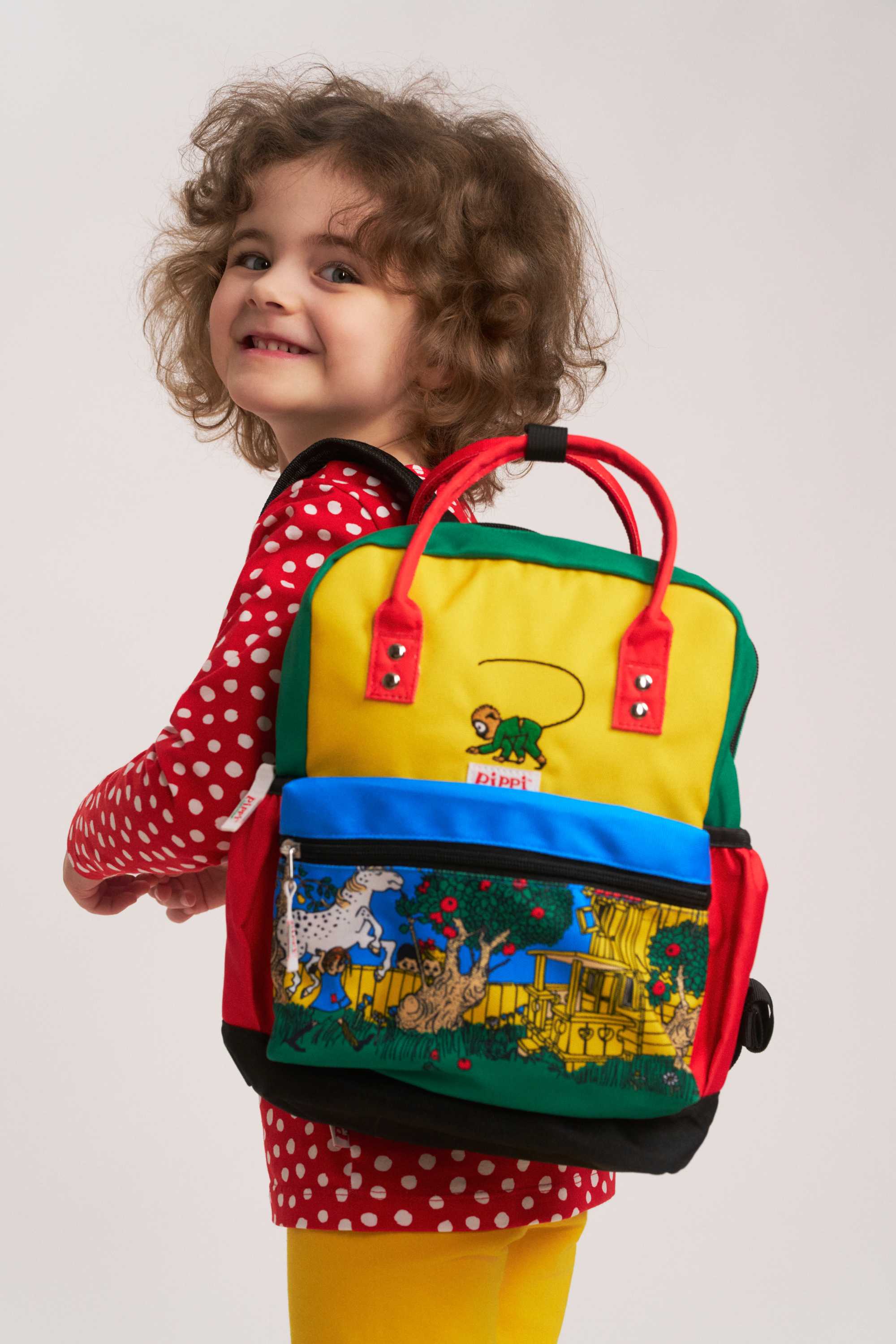 A brightly multicolored Jippo-style backpack that is comfortable to wear. The backpack features shades of blue, red, green, and yellow, along with a cheerful image of Pippi Longstocking. This rectangular backpack is comfortable, sturdy, and versatile, with carefully designed details focused on everyday usability. Dimension approx. 23 x 30 x 14 cm.