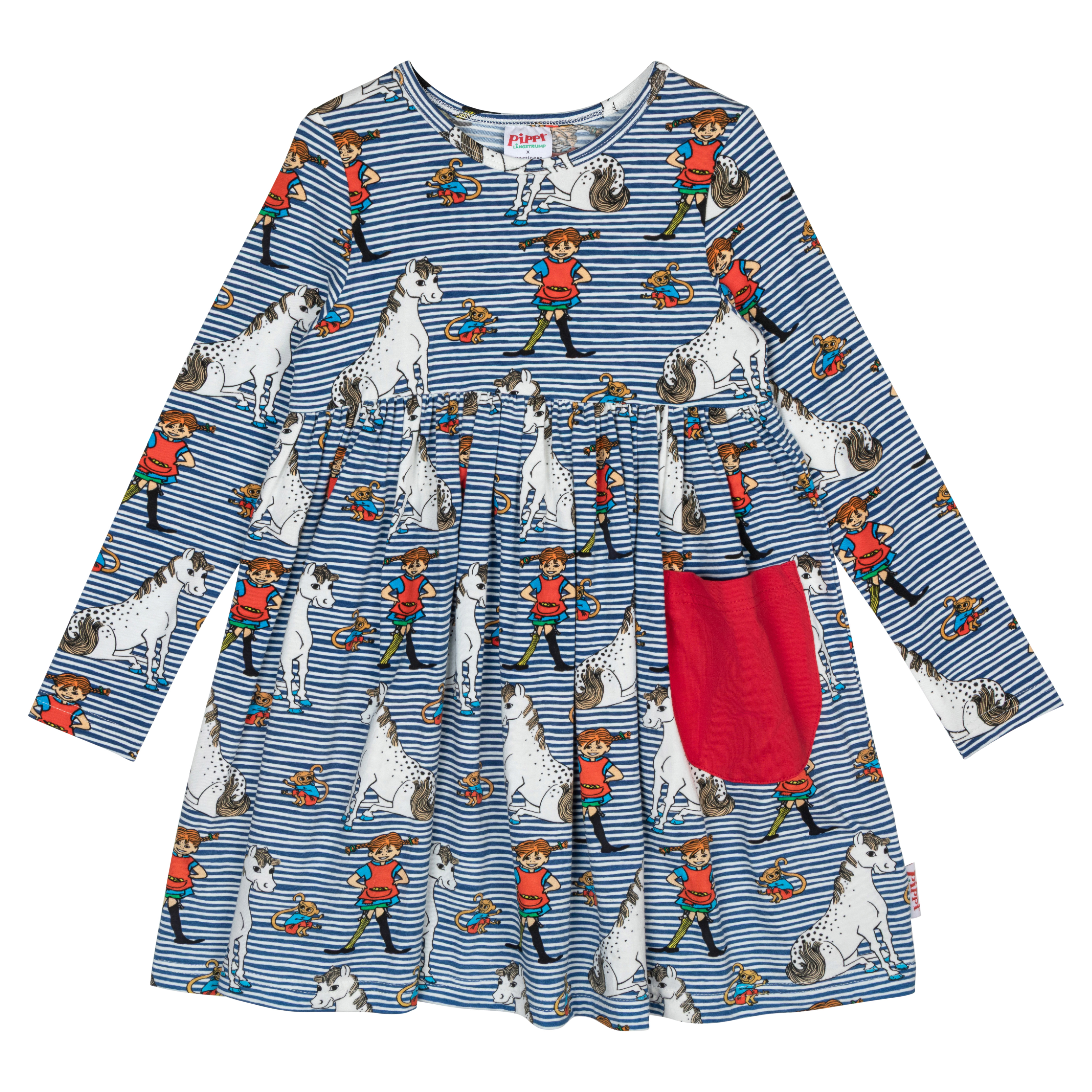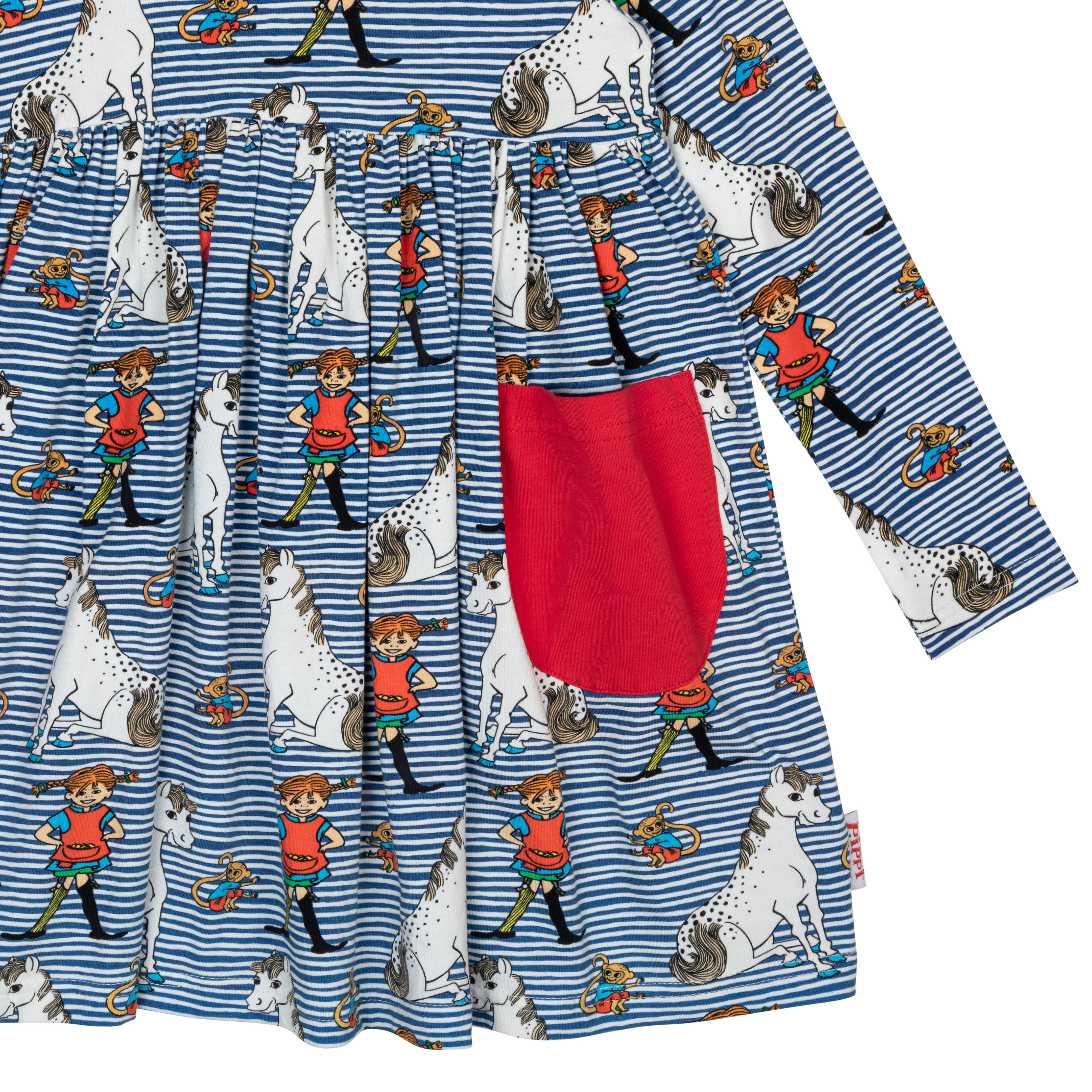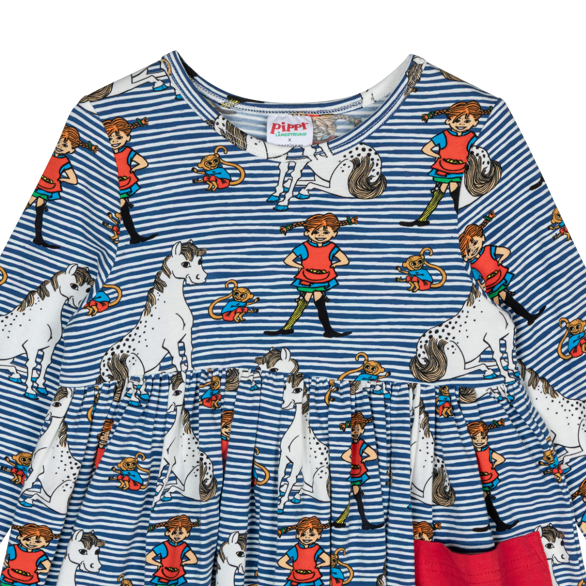 A playful children’s Peppi-themed dress by Martinex, made from an organic cotton blend. The blue-toned striped dress features a print of Peppi and her friends, and includes a sewn-on red pocket for little treasures. The dress has an A-line cut with long sleeves, a wide hem, and a round neckline. The soft material ensures a comfortable fit and breathability for all-day adventures. Designed in Finland.