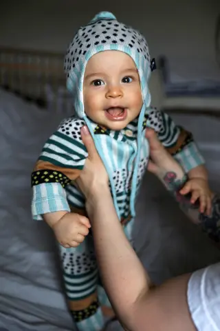 This cute babies' Moomin beanie is perfect for winter days. It's made from a soft and warm wool mix with a soft, non-itching cotton jersey lining. Thanks to the strings, this mini hat stays secure.