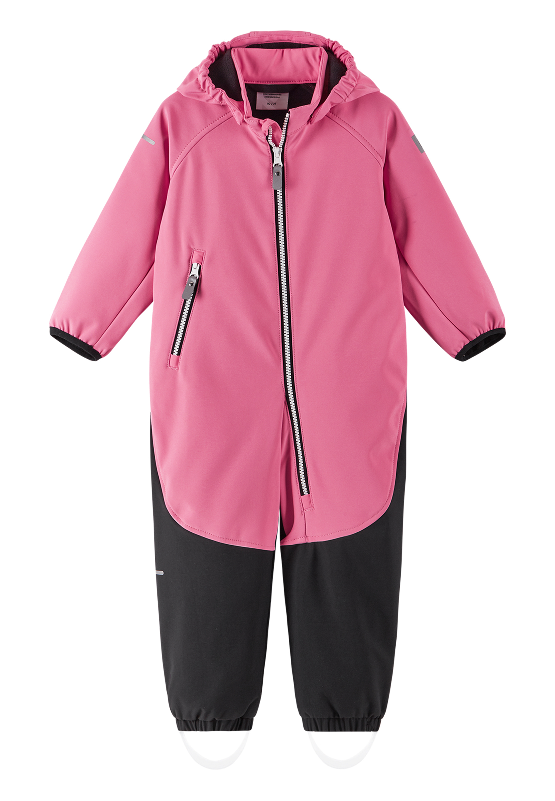 This durable toddlers' softshell overall is windproof, breathable and water-repellent. It comes in sizes starting from 74 cm, so even the smallest family member can take a nap outside in comfort while wearing it! The hood on this Reima one-piece protects from chilly winds but is also safe when playing, as it will come off if it gets caught on something. The full-length zipper with a comfy chin guard means the softshell design is easy to pull on. This toddlers' suit has durable reinforcements on the bottom for long-lasting wear.