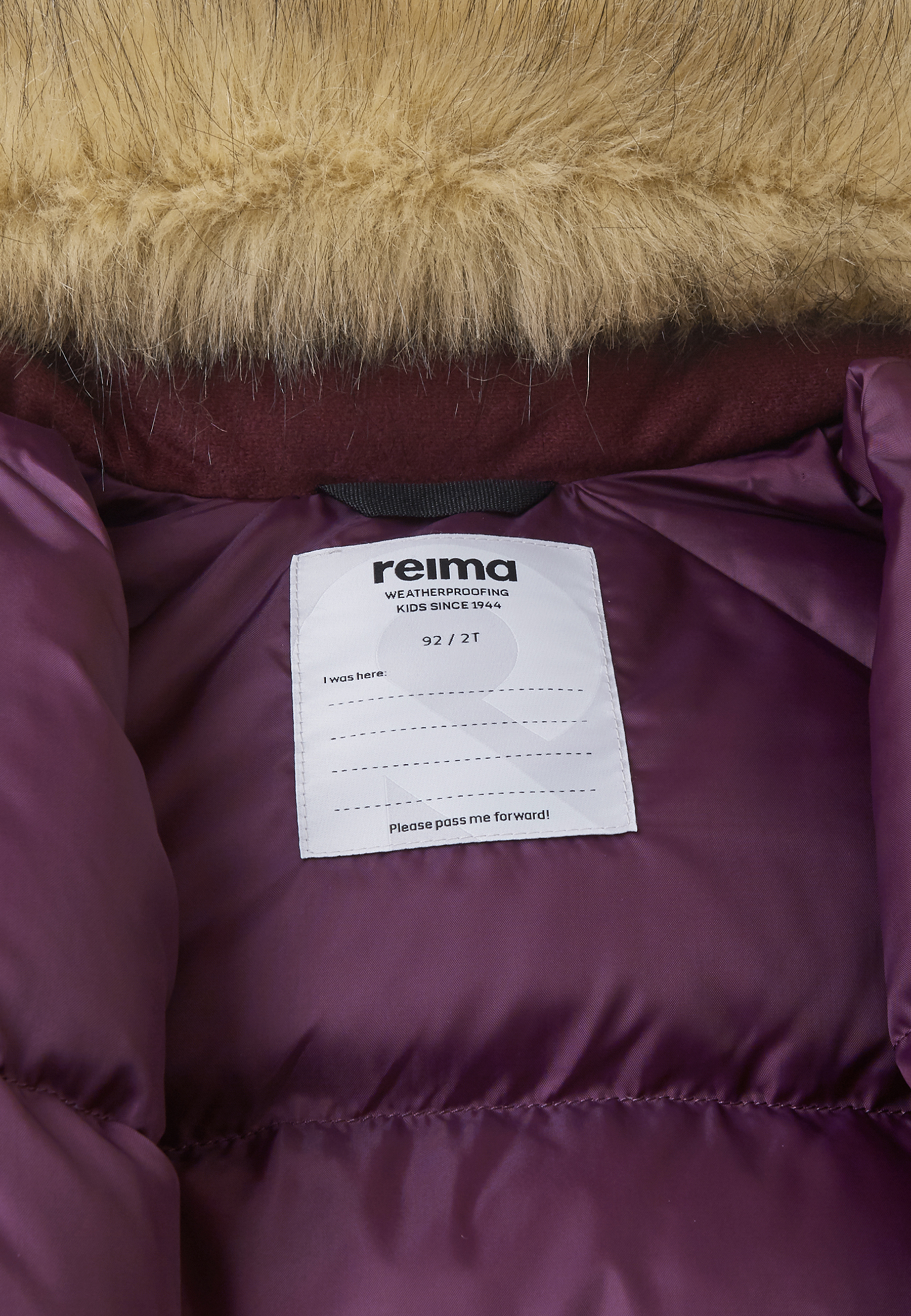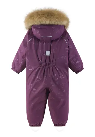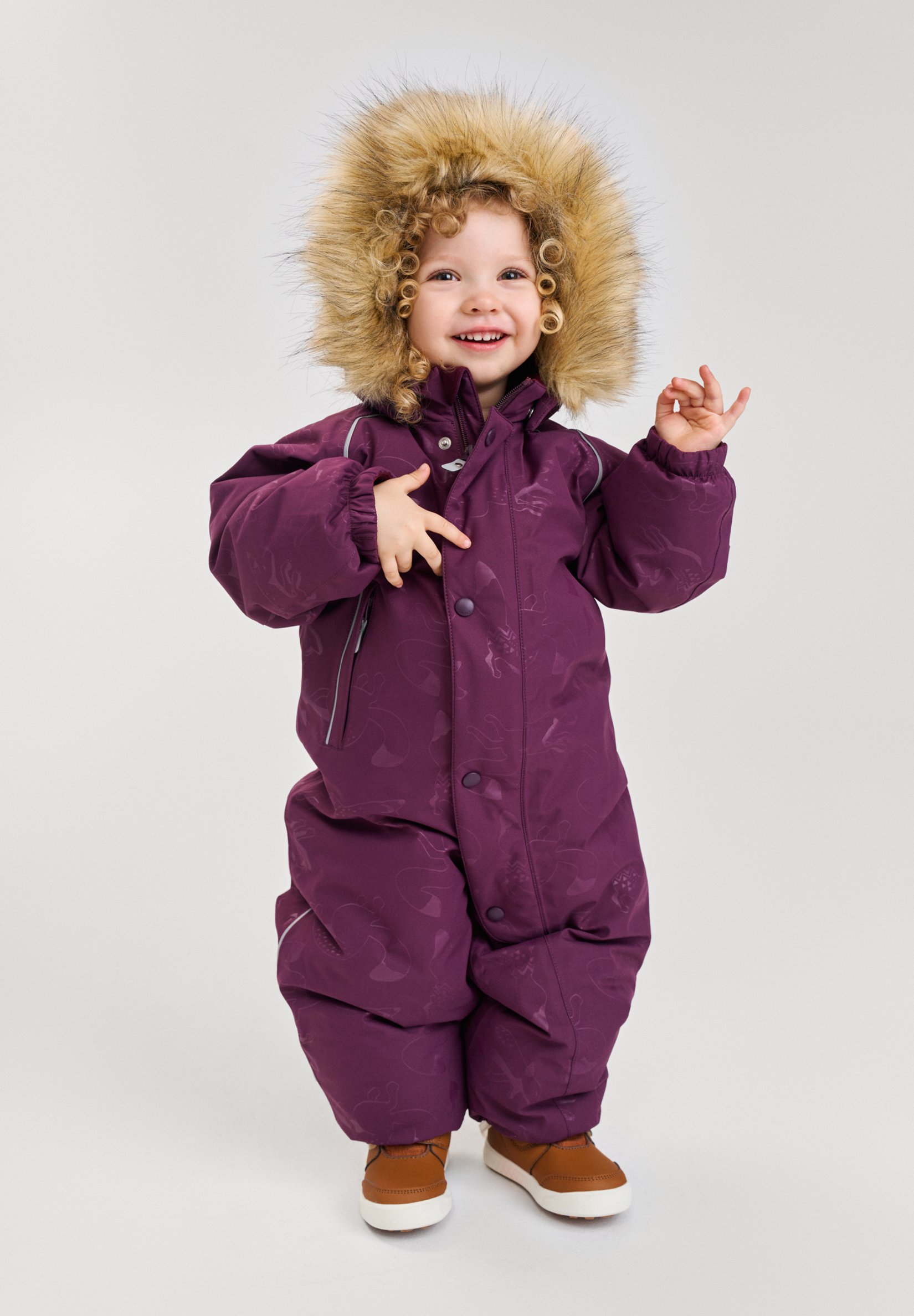 Reimatec toddlers' down snowsuit has lots of fab features: All its seams are sealed waterproof and it has a water- and dirt-repellent surface. The insulation is made up of RDS certified 60% down and 40% feathers and the seat has extra wadding for more warmth. The smooth lining makes slipping it on wriggly little ones easier, and the detachable hood is safe because it comes off easily if caught on something. A small zipper pocket keeps tiny treasures safe. Durable silicone foot loops keep the trousers hems in place, protecting little ankles from moisture and the cold. This tumble-dryer-friendly winter all-in-one is a great choice for crawling in the countryside or strolling in the city!
