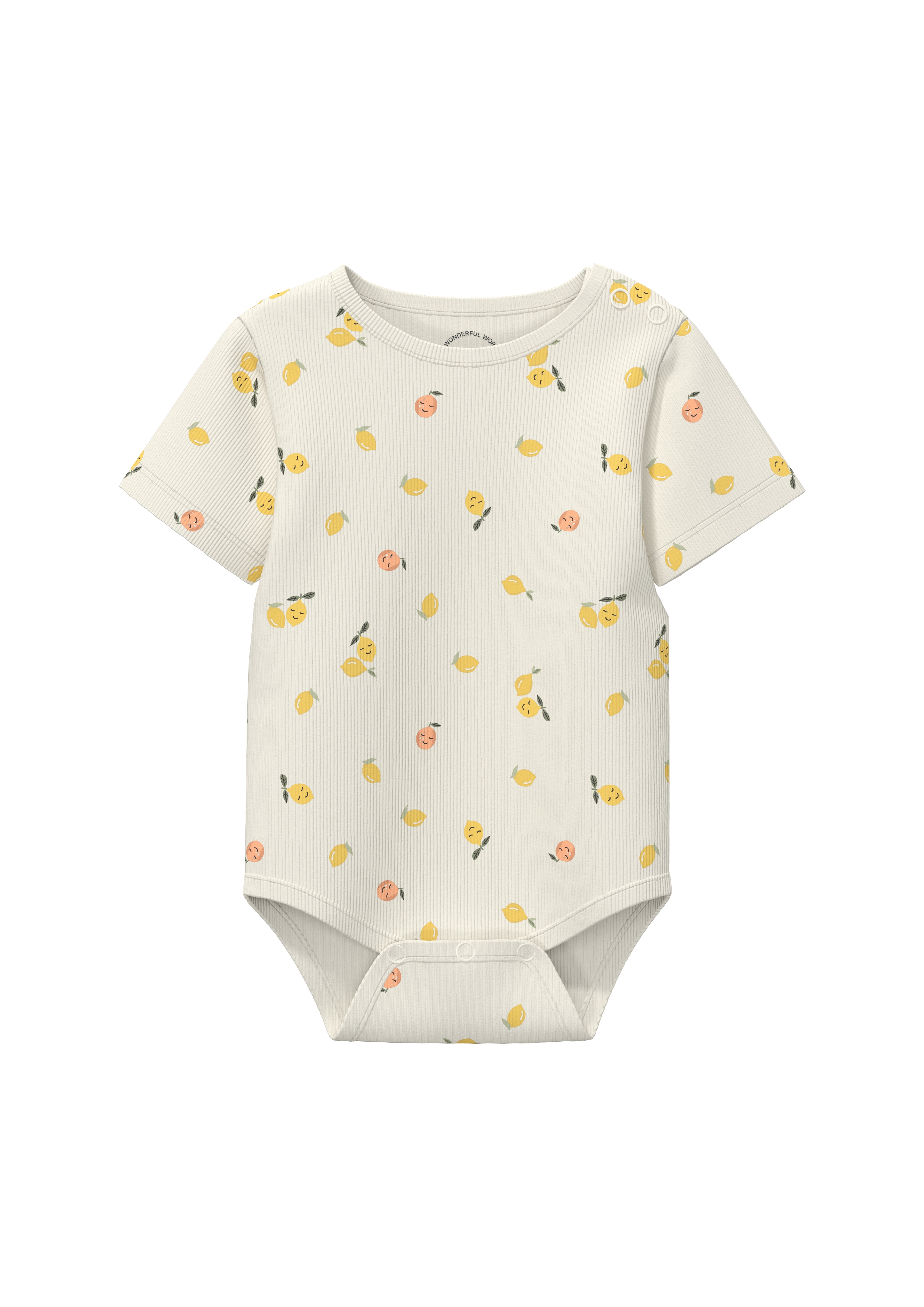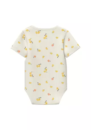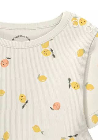 Soft ribbed s.Oliver Baby bodysuit, perfect for everyday wear. The short sleeves and cheerful citrus-themed print bring joy to dressing. This body is a reliable choice for warm days, whether at home or on the go. The comfortable fabric feels gentle against delicate skin, while practical side snap fastenings and a round neckline make dressing quick and easy.