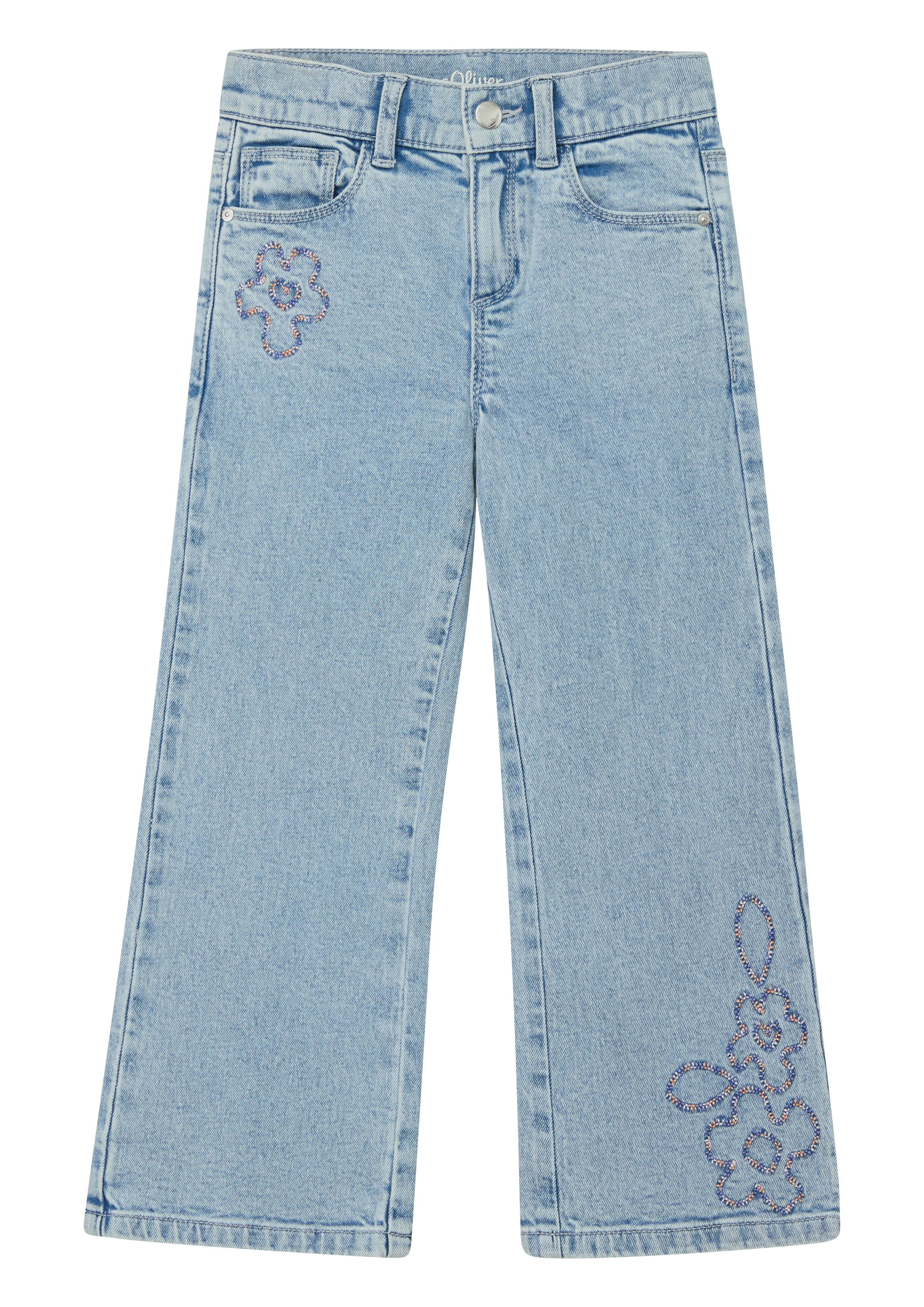 The regular fit with wide legs and a practical adjustable waist ensures a perfect fit. The jeans feature charming floral embroidery, five pockets, and a trendy used effect.