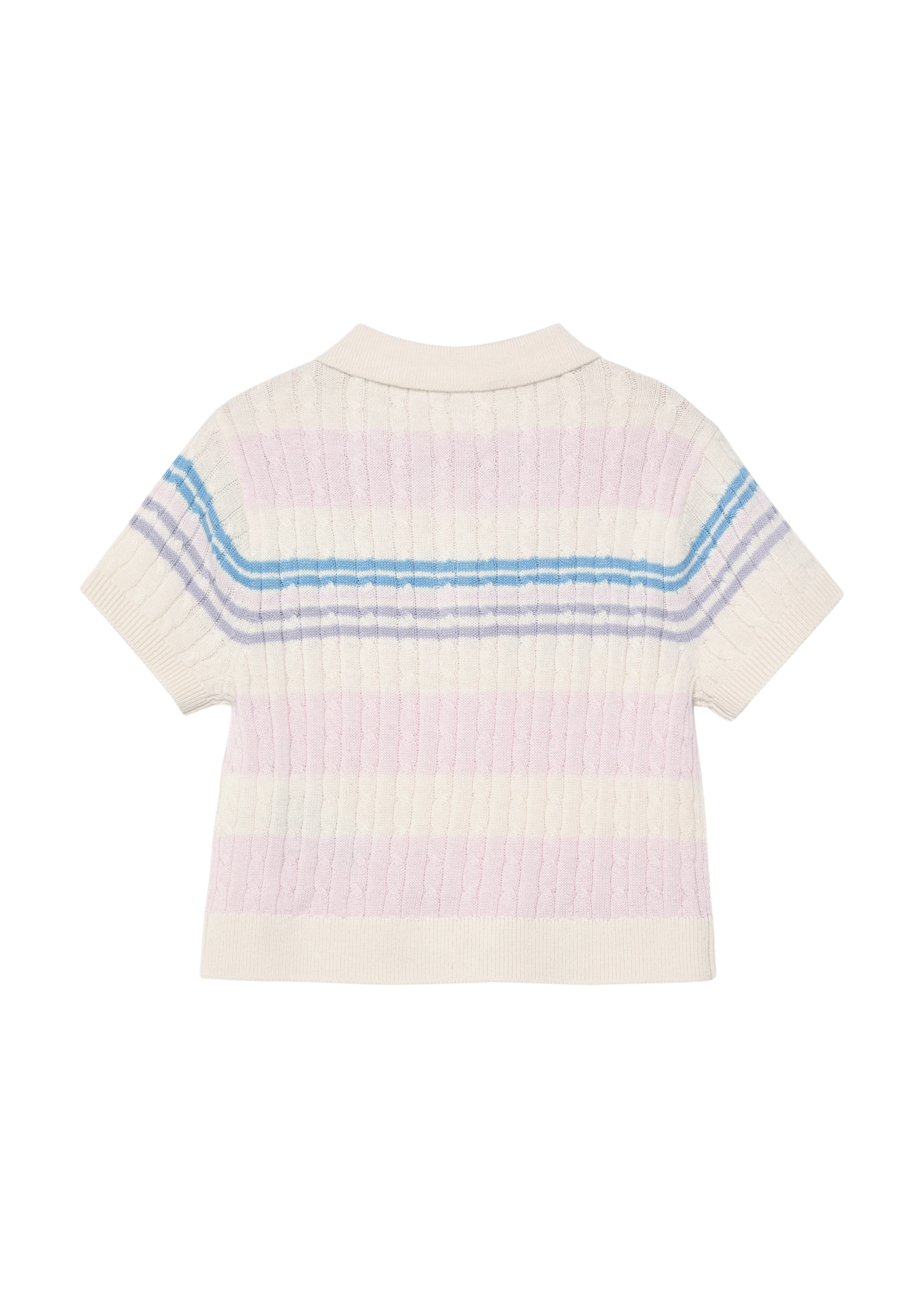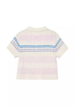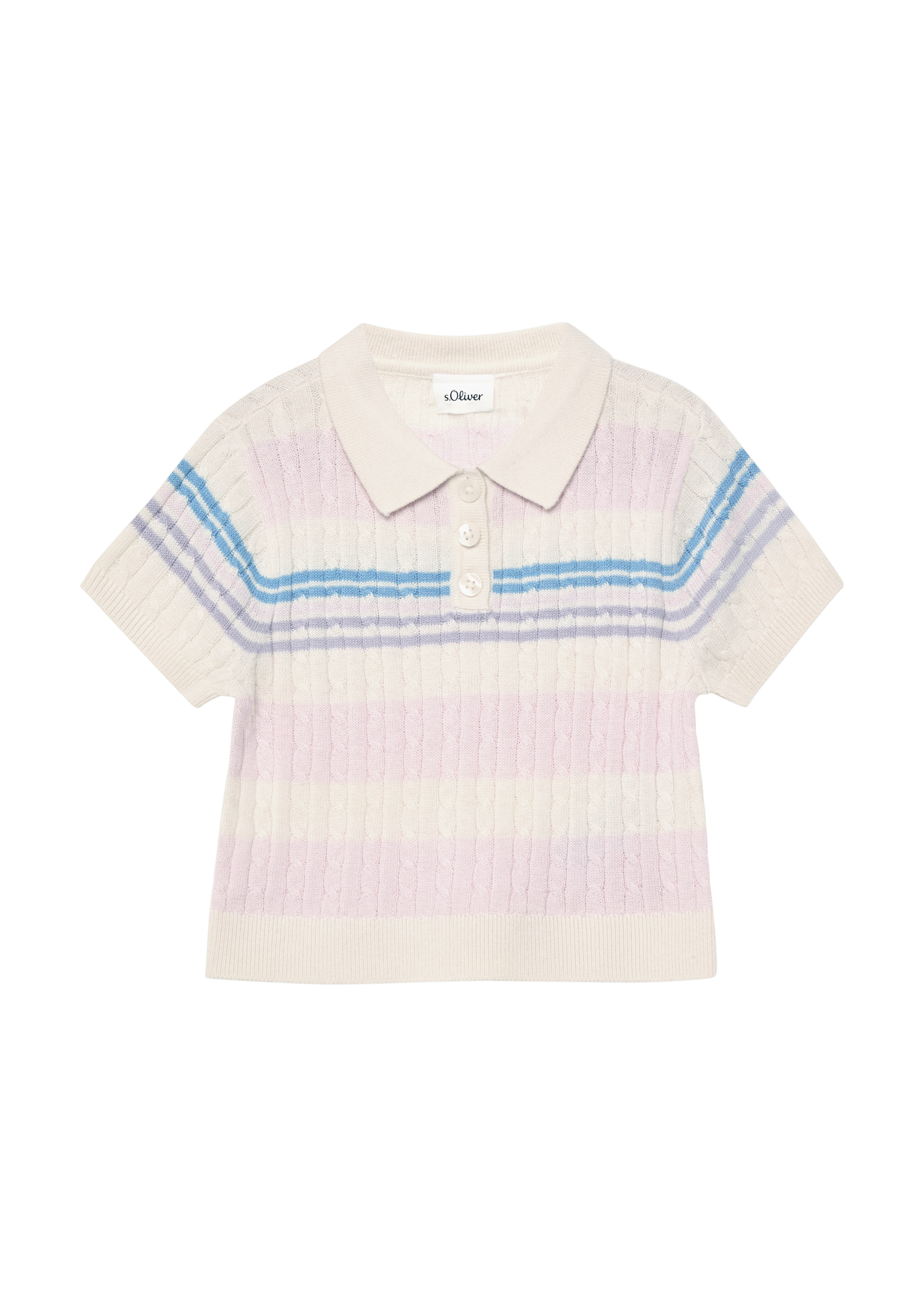 The s.Oliver cute cable-knit patterned polo sweater with stripes charms with its lovely pastel shade, bringing a playful yet classic touch to the look. The soft knit fabric ensures comfortable wear and adds a refined finish to the outfit.