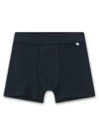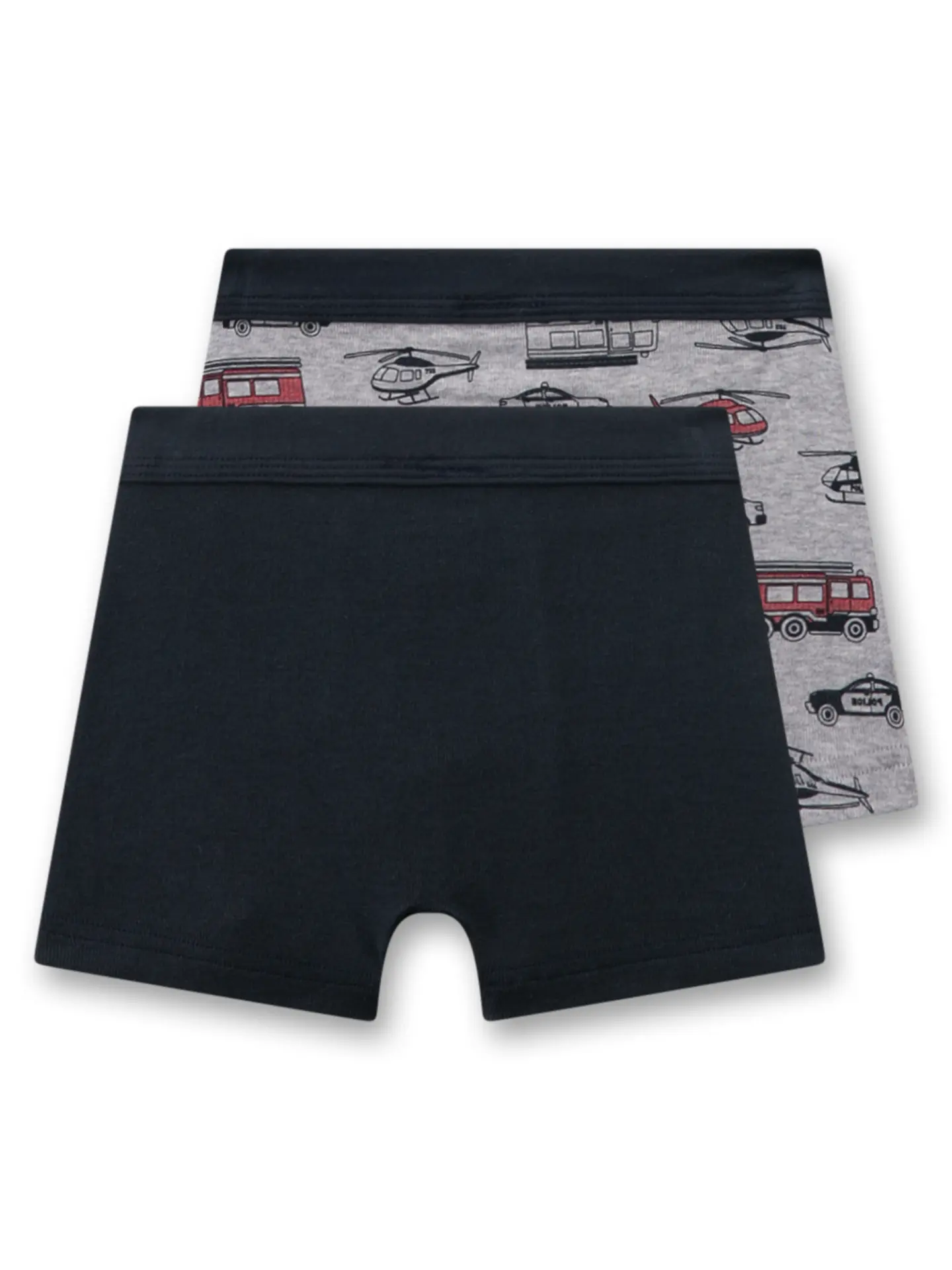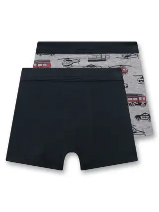 Sanetta boxers for boys in a 2-pack set. Set includes one pair is solid dark blue, while the other boasts a vibrant all-over print of fire trucks, police cars, and helicopters in red, black, and white.