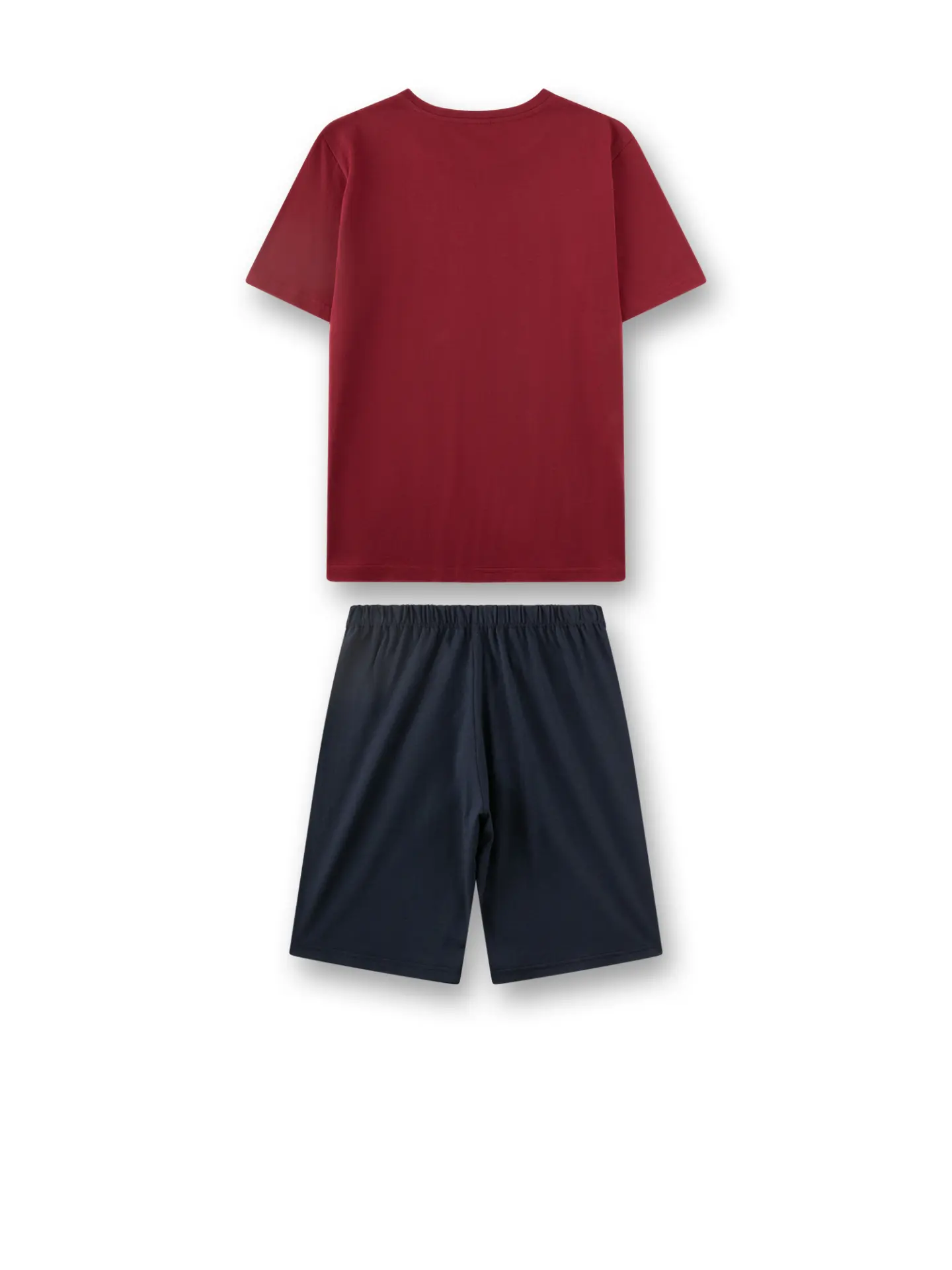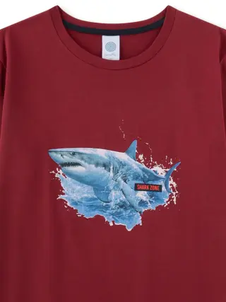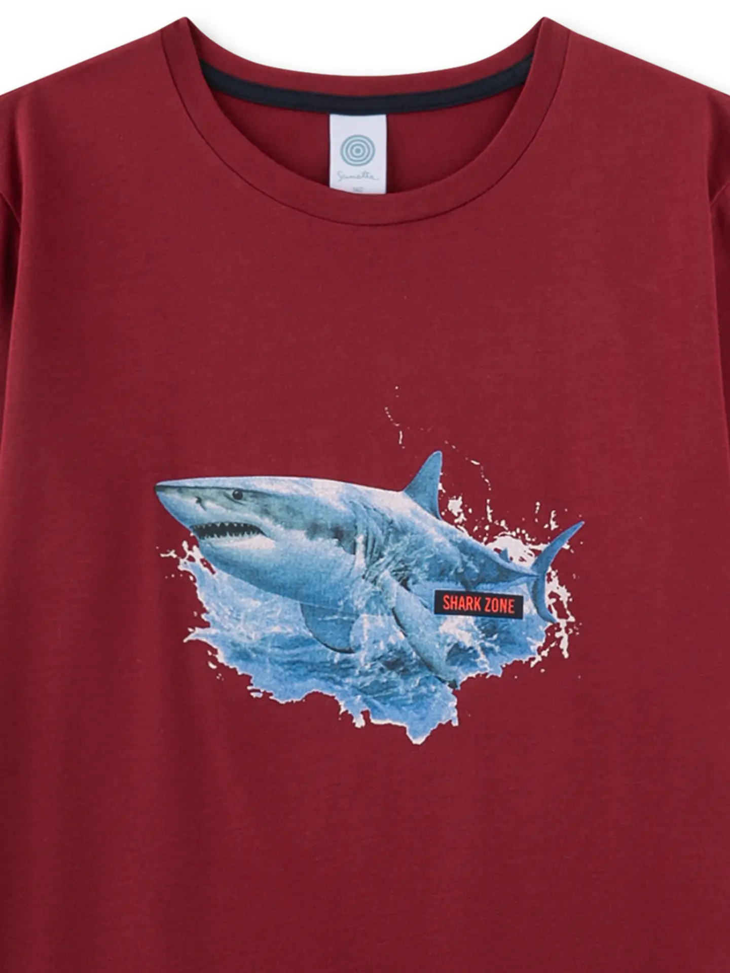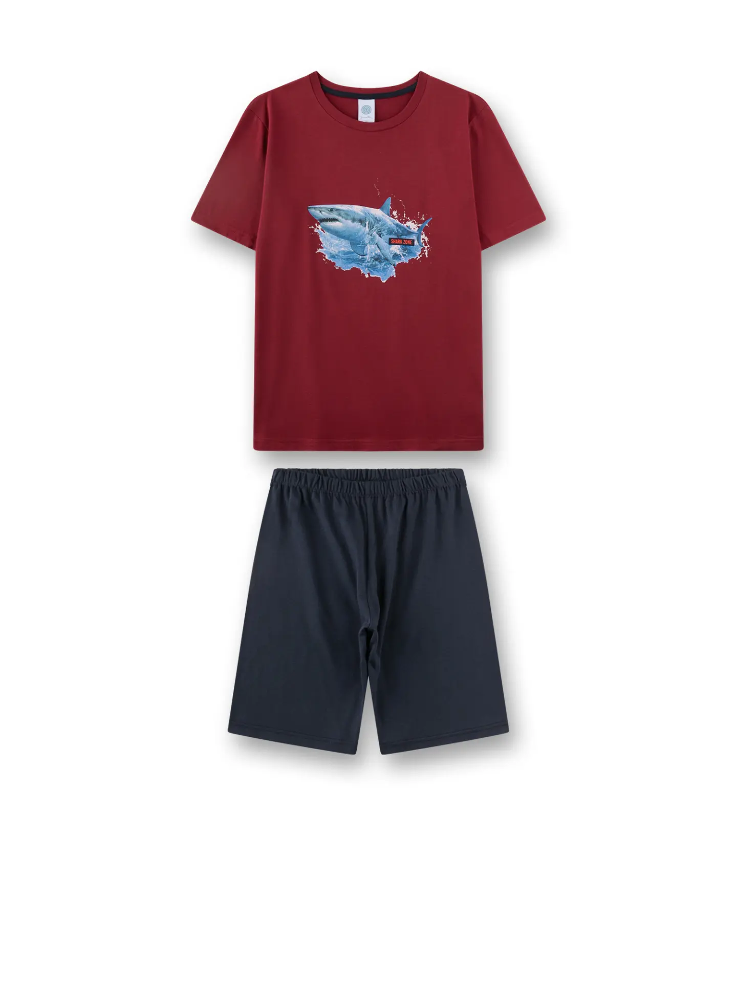 Sanetta pyjamas set. This set includes short-sleeved burgundy top and features a large, photorealistic shark print with splashing water and the words "SHARK ZONE" on the front. Complete the look with dark blue shorts, that are knee-length, simply designed, and have an elasticated waistband for a comfortable fit. Made from 100% cotton.