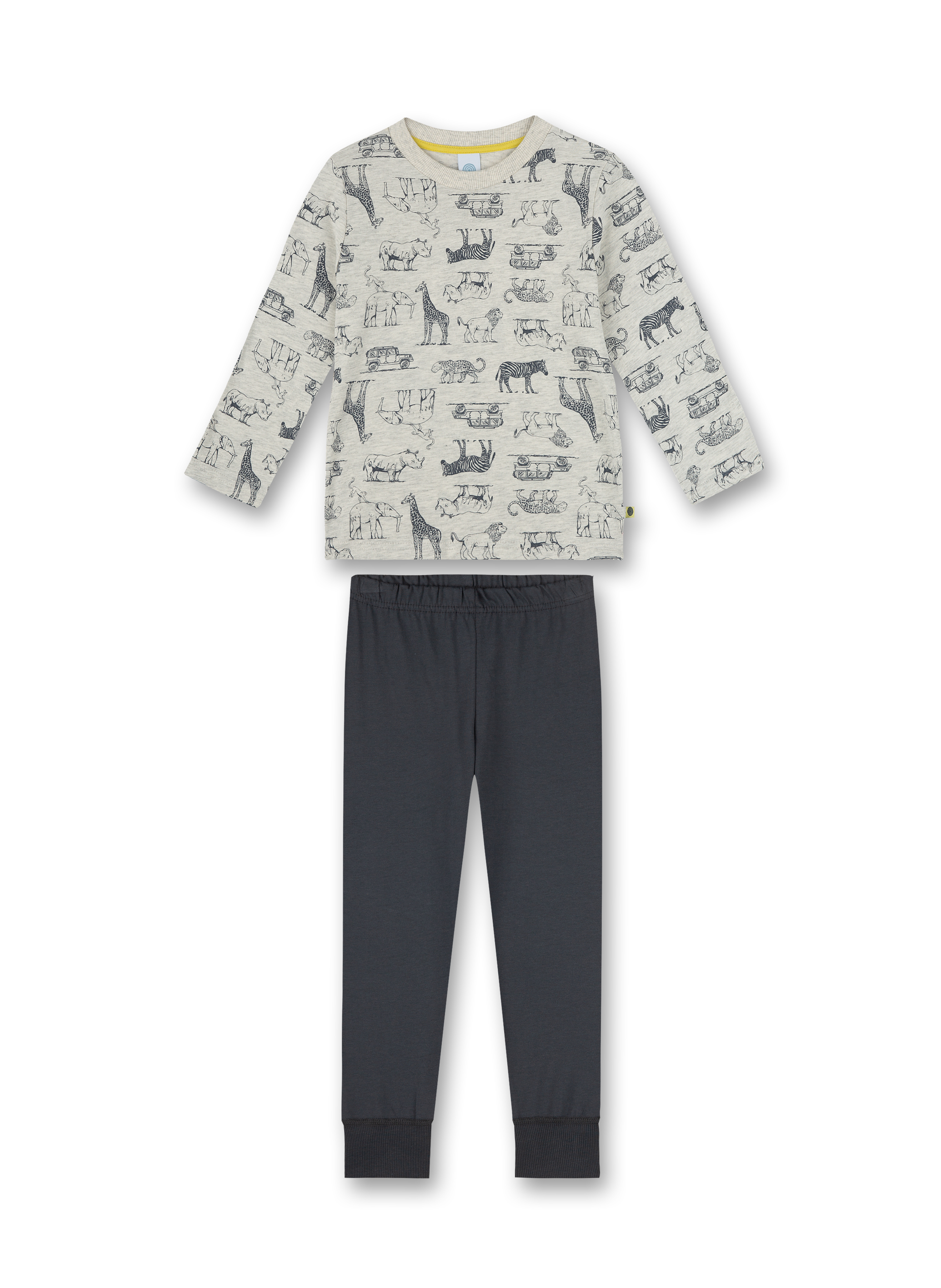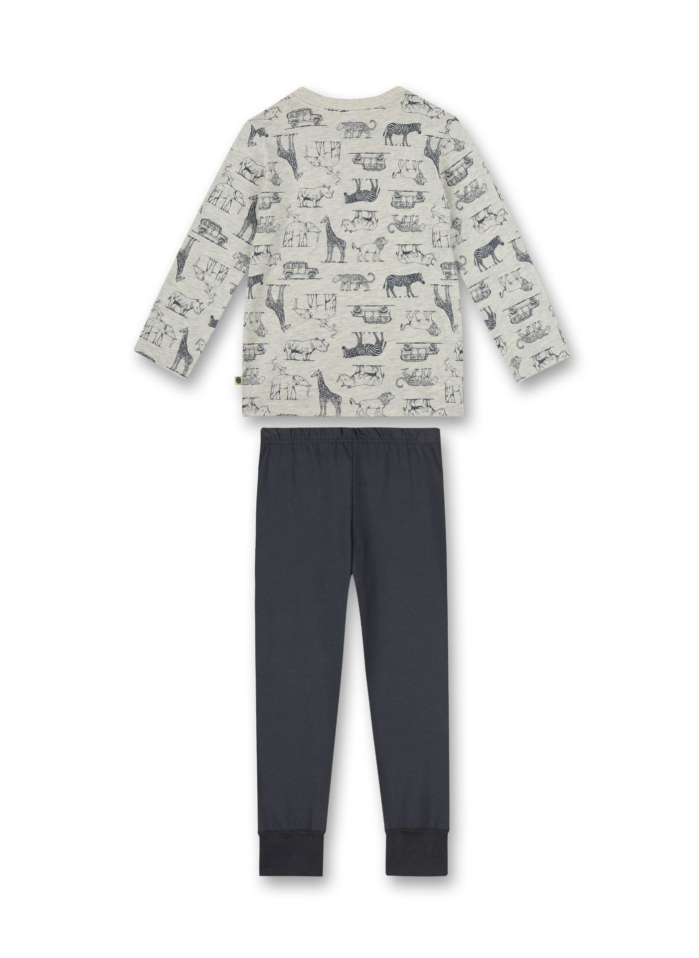 Sanetta pyjama set with a long-sleeved safari themed shirt and solid grey pants. The material is soft and light organic cotton that feels comfortable on the skin.