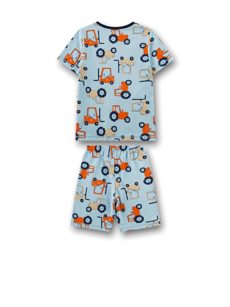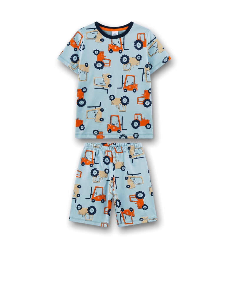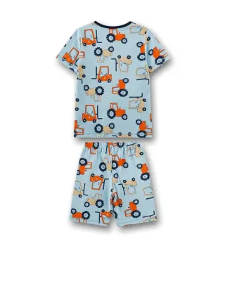 Light blue Sanetta pyjama set decorated with tractor prints, featuring a T-shirt and shorts. The set includes a light blue short-sleeved shirt with a tractor and crane illustration, as well as matching shorts with the same print and an elastic waistband. Made of 100% cotton.