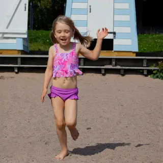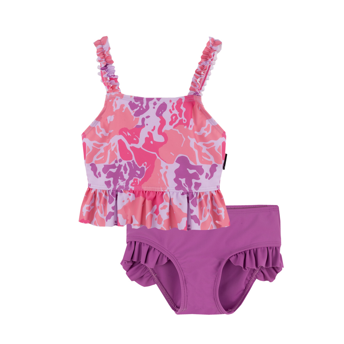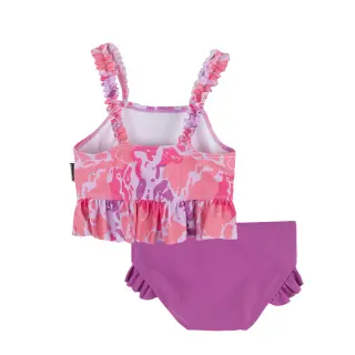 Jonathan bikini mallinen aurinkosuojauimapuku hauskassa ja pirteän värikkäässä kuosissa. Uimapuvun kuvioidussa yläosassa on frillaolkaimet ja hauska röyhelö alareunassa. Yksivärisessä alaosassa on röyhelöt sivuilla.