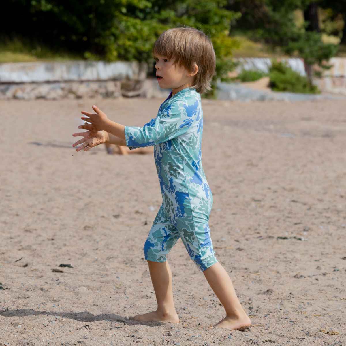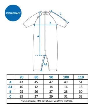 Haalarissa on edessä pitkä vetoketju, jonka ansiosta se on helppo pukea ja riisua. Puolipitkät hihat ja lahkeet suojaavat herkkää ihoa.
