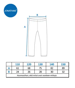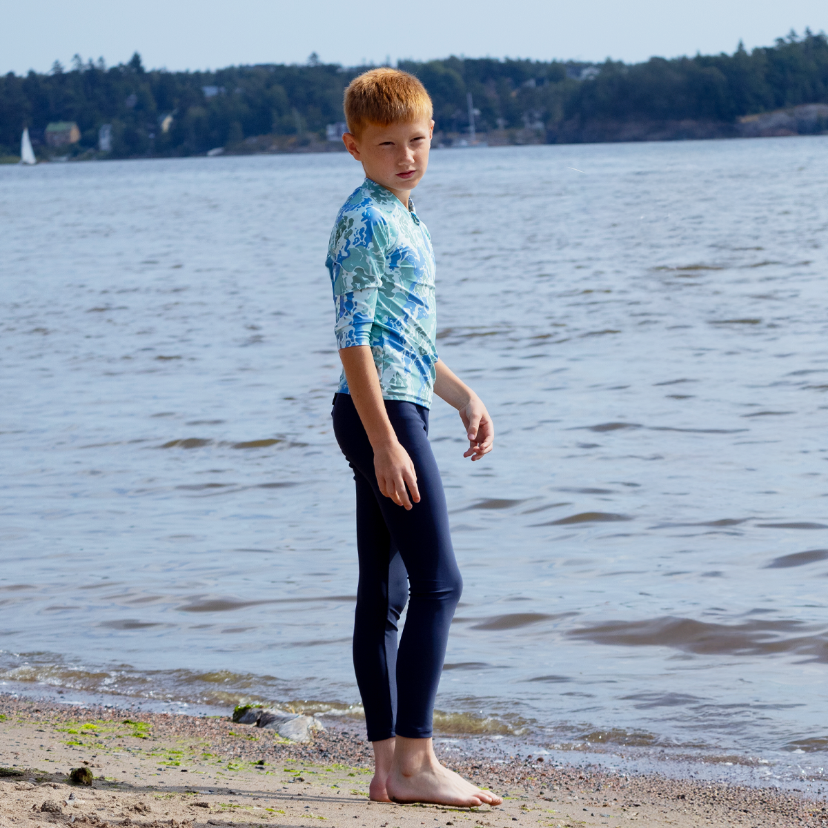 Kokopitkät Jonathan aurinkosuojahousut suojaavat lapsen herkkää ihoa auringon haitallisilta UV-säteiltä. Leggingseissä on napeilla säädettävä kuminauhavyötärö,