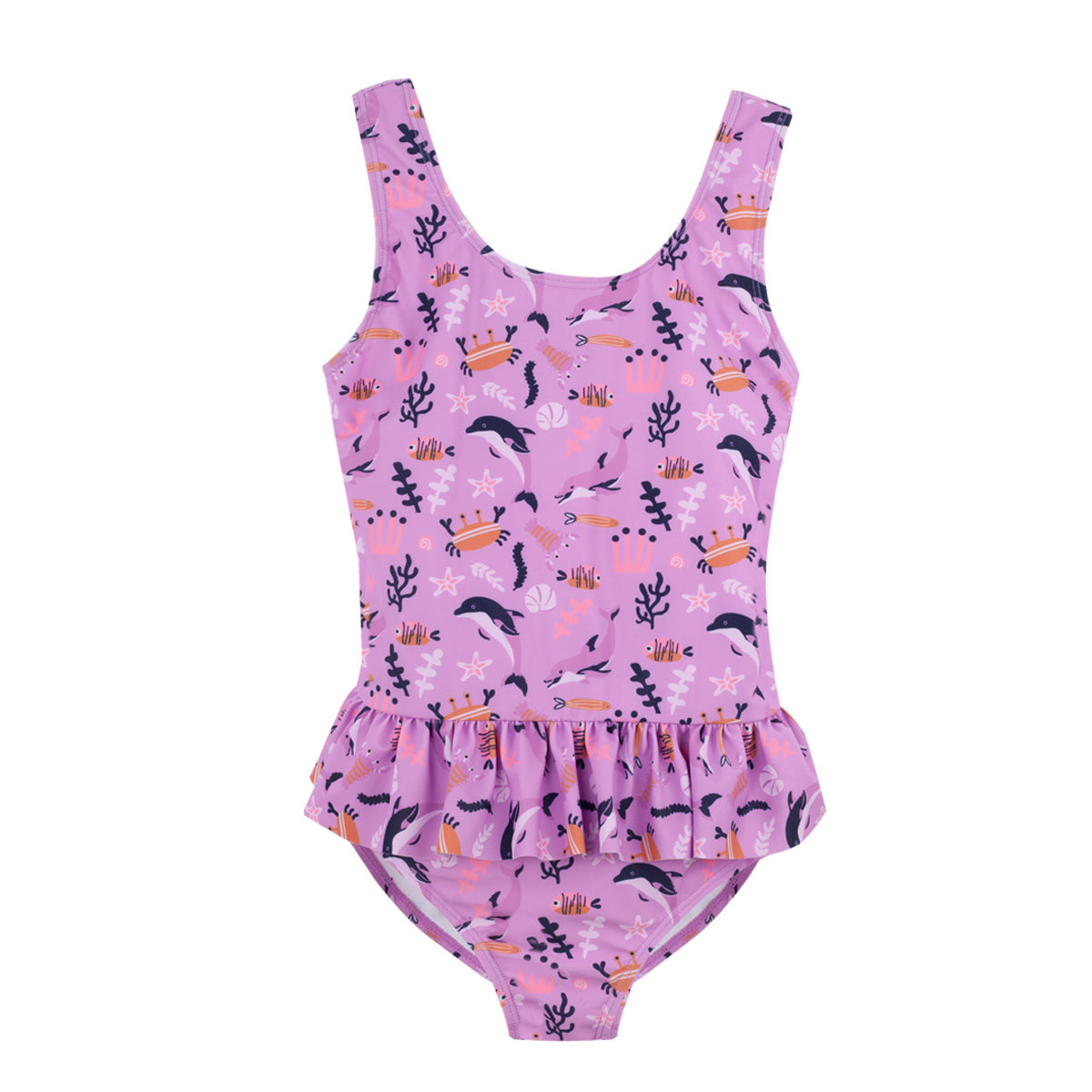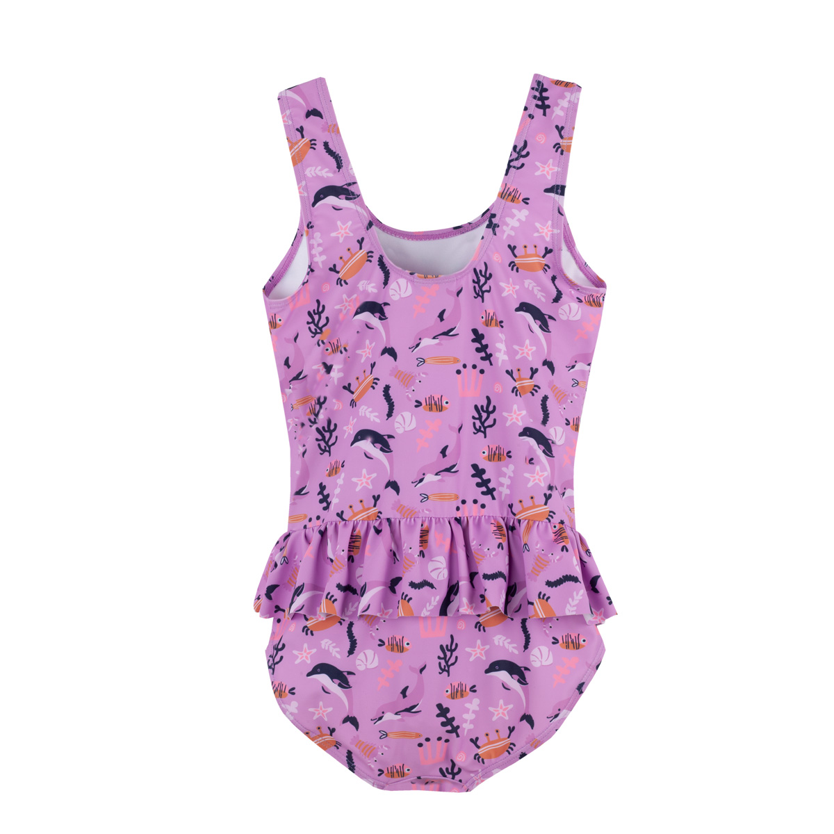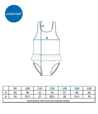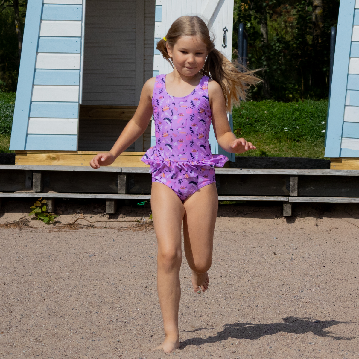 Jonathan aurinkosuoja uimapuku. Hihattomassa uimapuvussa on hauska kuosi ja sievä frilla vyötäröllä.