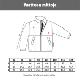 Lajittele pyykki väreittäin. Sulje vetoketjut ja tarrat. Pestävä nurin käännettynä 40 asteessa. Käytä pesuainetta, joka ei sisällä valkaisuainetta. Älä käytä huuhteluainetta. Voidaan kuivata kuivausrummussa tai -kaapissa korkeintaan 40 asteessa.