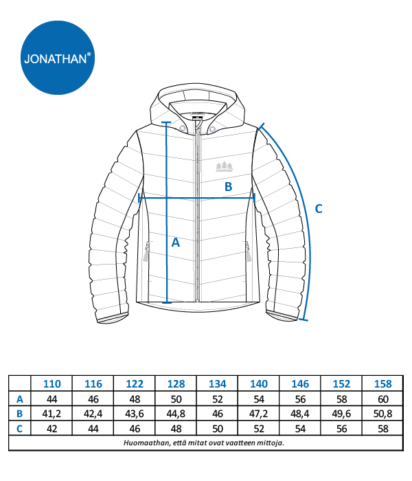 Jonathan kevyttoppatakki väikauteen! Hengittävästä ja vettä hylkivästä materiaalista valmistettu takki tuo lämmintä suojaa välikauden vaihtelevissa säissä.