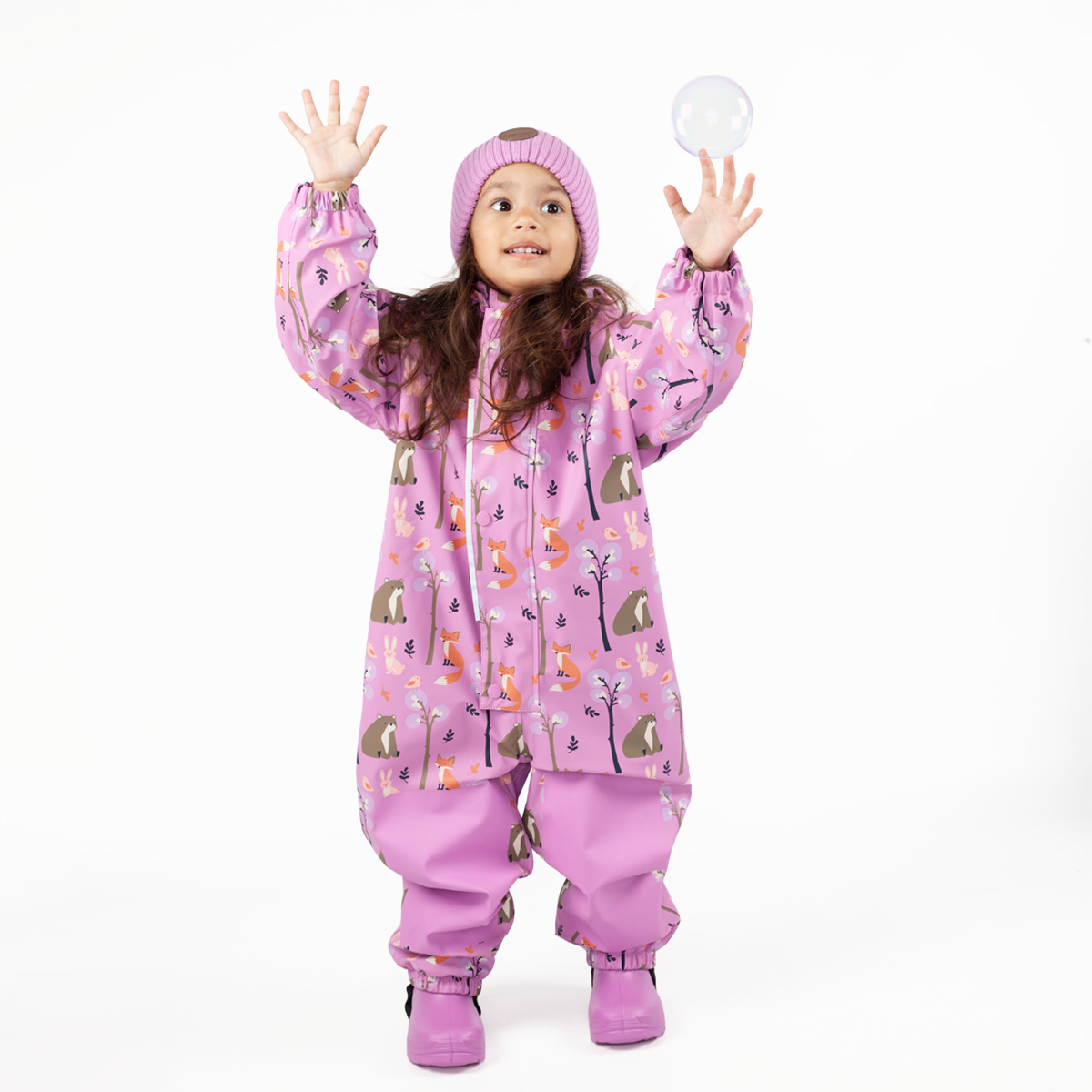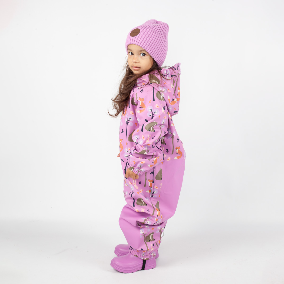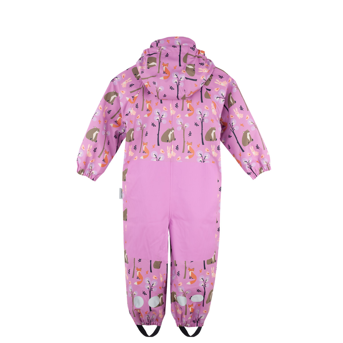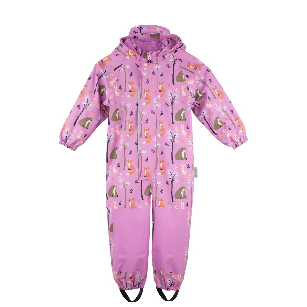 Jonathanin sadehaalarin kaikki saumat on hitsattu vedenpitäviksi. Haalari on mukava päällä taipuisan päällysmateriaalin ja pehmeäksi harjatun trikoovuoren ansiosta. Sen alle voi tarvittaessa pukea väliasun koleammilla keleillä. Kuosin suloiset metsän eläimet piristävät harmaintakin sadepäivää!