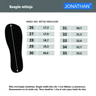 Jonathan supertyylikkäät vedenpitävät talvikengät pikalukittavalla joustonauhakiinnityksellä. Kengissä on leveä ja korkea varvastila, joka antaa varpaille luonnollisesti tilaa liikkua ja vahvistaa jalkapohjan lihaksia. Taipuisa ja pitävä TPR-ulkopohja tarjoaa erinomaisen pidon eri alustoilla. Vuorimateriaali sisältää 60% villaa tehden näistä talvikengistä sopivan kylmimpiinkin pakkasiin.