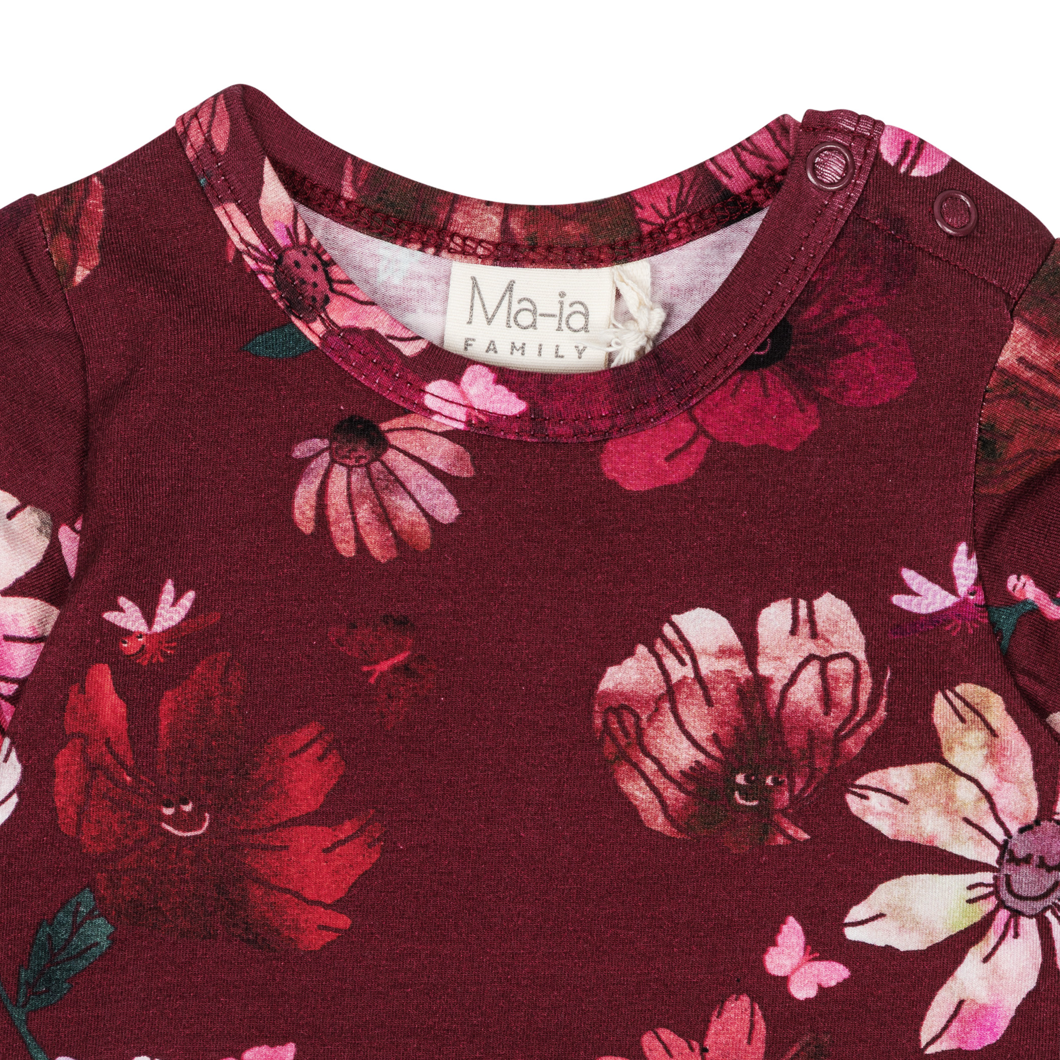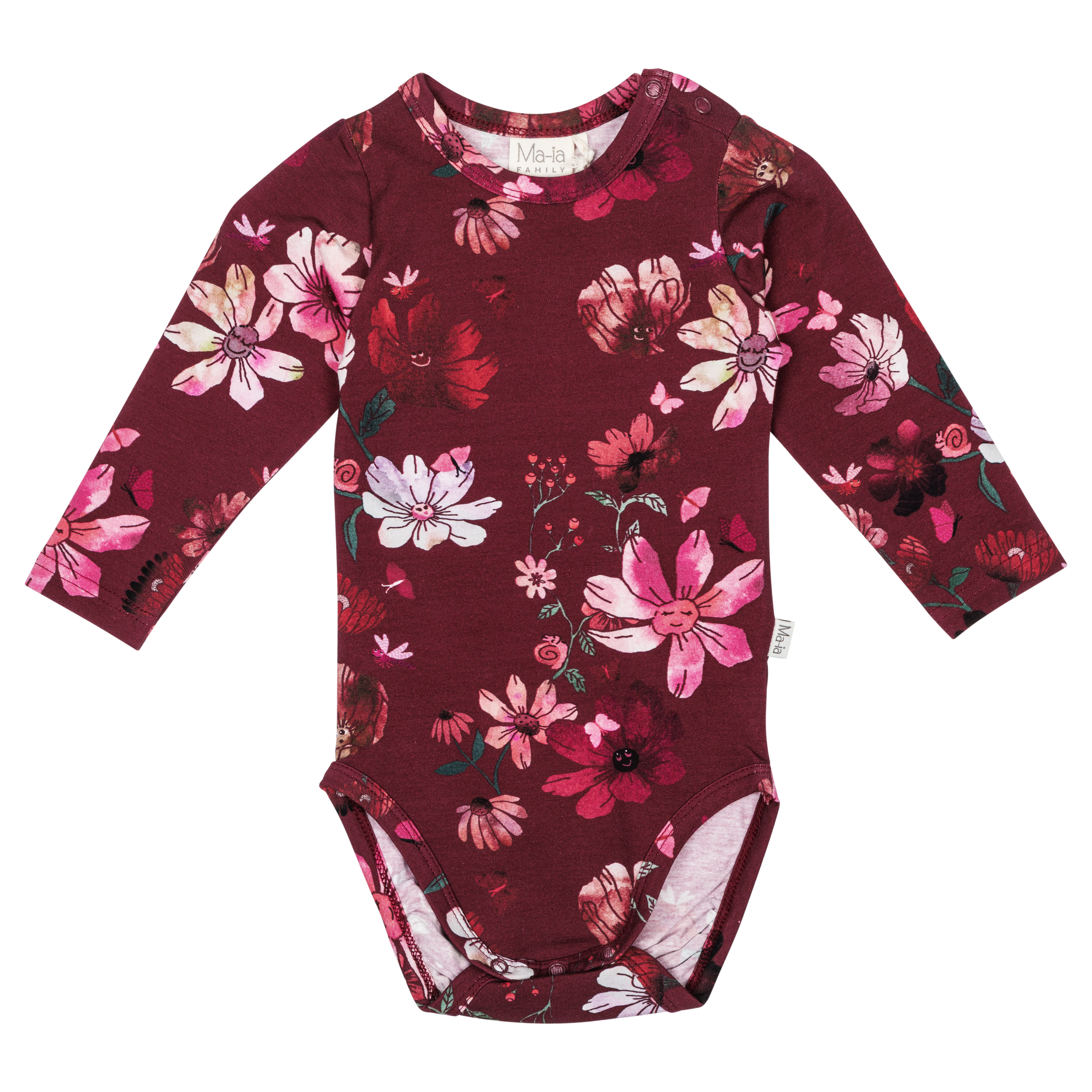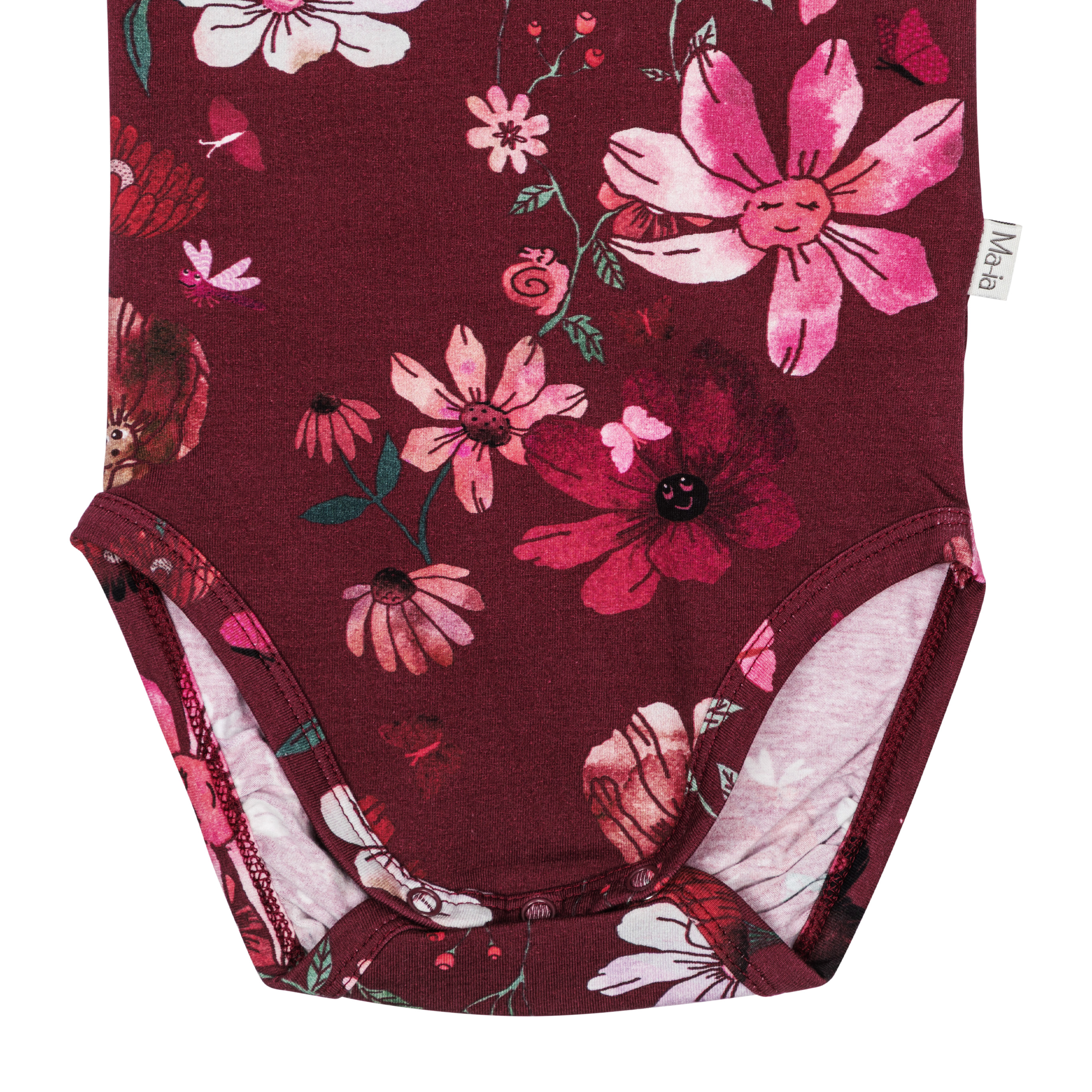 Tummanpunainen vauvojen pitkähihainen body, jossa on nepparikiinnitys. Bodyssa on suloisen leikkisä Talvipuutarha-kuosi.